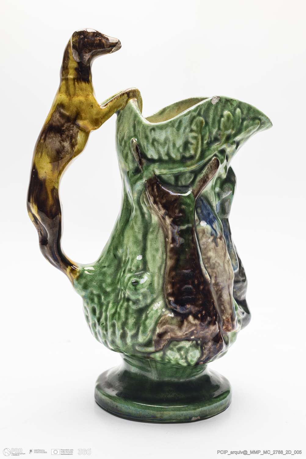 Matéria/Técnica: Barro vermelho moldado e modelado. Vidrado polícromo: castanho, verde e amarelo; Cronologia: século XX; Autoria: Desconhecido / Caldas da Rainha, Portugal; Dimensões (cm): Altura: 27; Largura: 13; Comprimento: 16.
