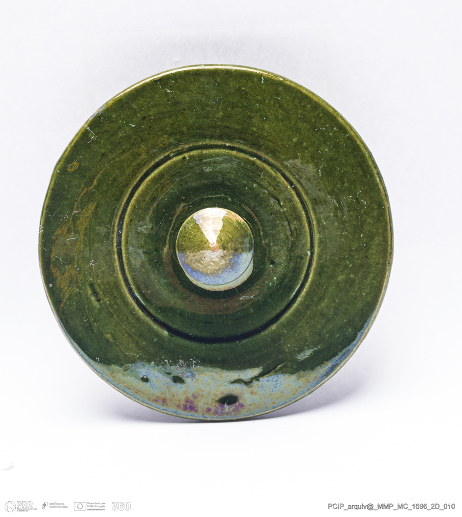 Matéria/Técnica: Barro vermelho rodado e modelado. Vidrado polícromo: camurça no interior, branco de estanho e verde de cobre no exterior; Cronologia: século XX; Autoria: Desconhecido / Caldas da Rainha; Dimensões (cm): Altura: 25; Largura: 23,6.