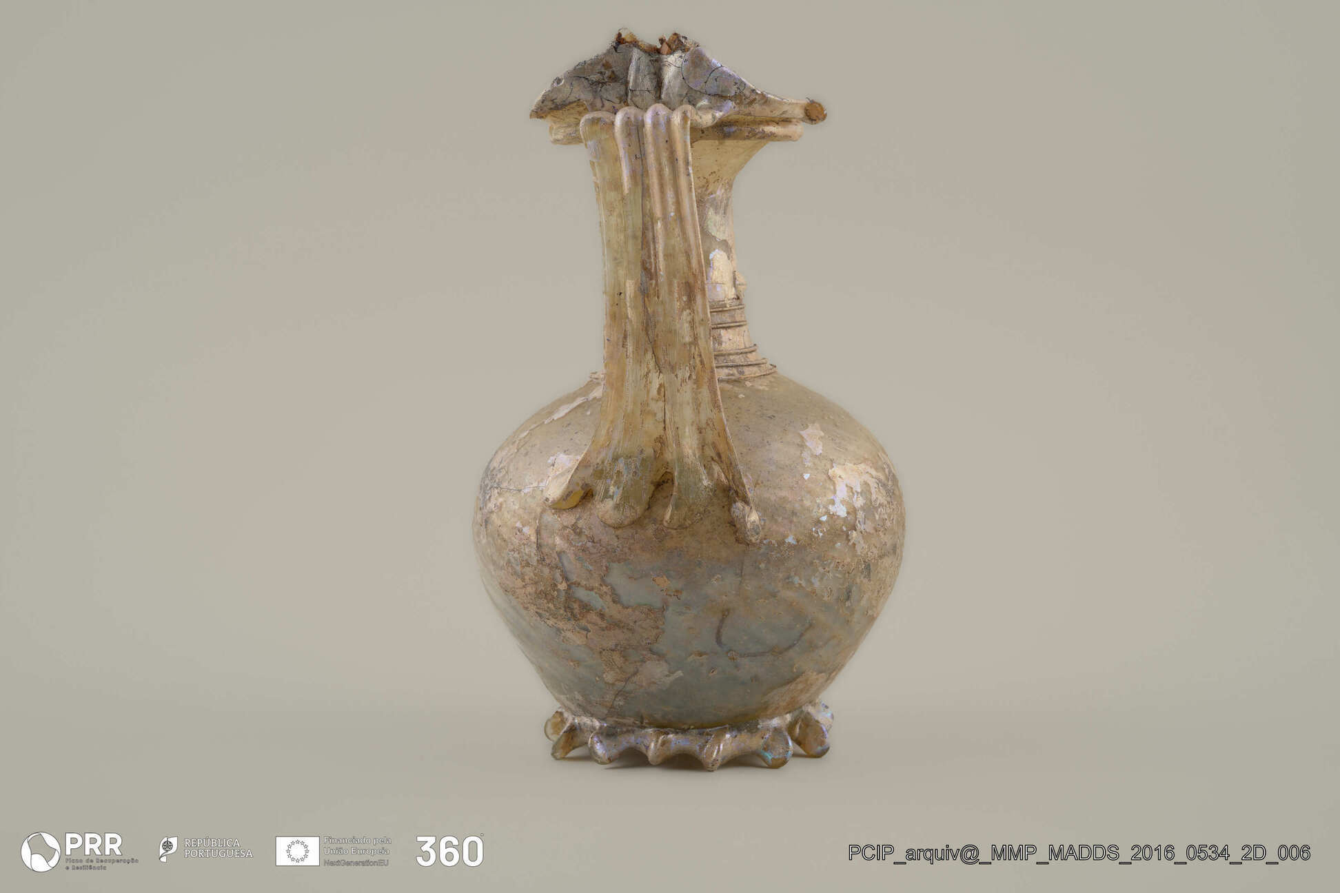 Matéria/Técnica: Vidro; Cronologia: Século IV d.C; Autoria: Desconhecida; Dimensões (cm): 16 x 11 x 11.