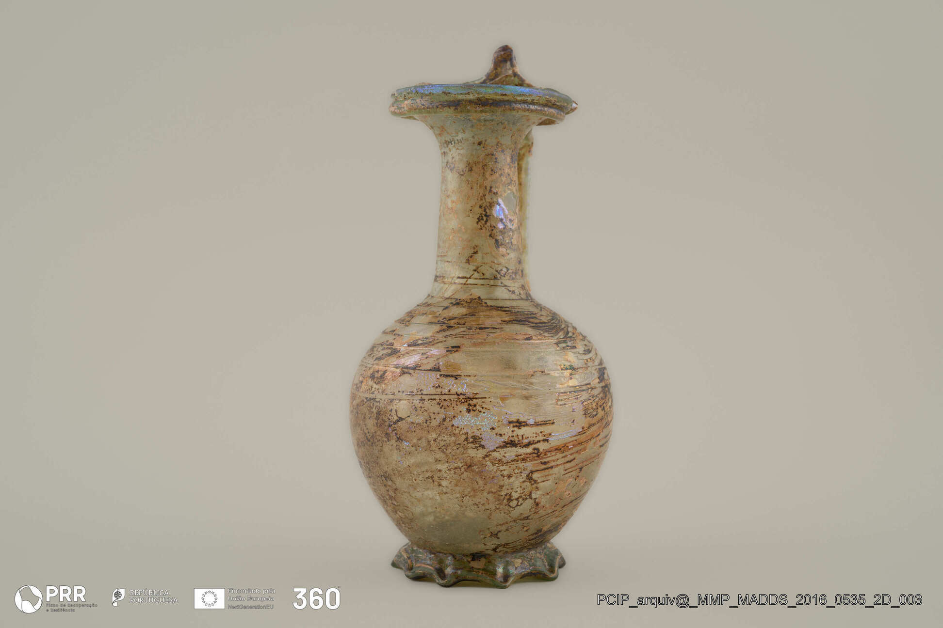 Matéria/Técnica: Vidro; Cronologia: Século IV d.C; Autoria: Desconhecida; Dimensões (cm): 16 x 8 x 8.