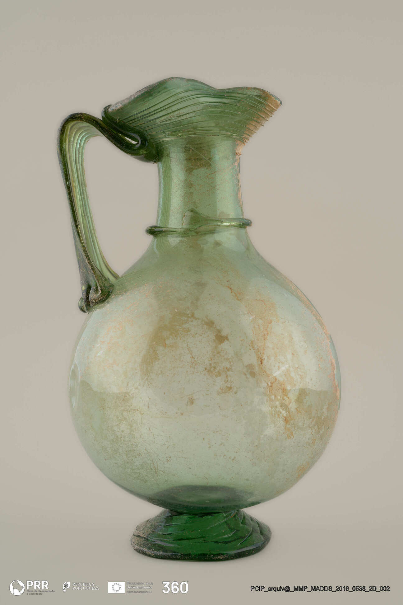 Matéria/Técnica: Vidro; Cronologia: Século V d.C; Autoria: Desconhecida; Dimensões (cm): 25 x 15 x 15.