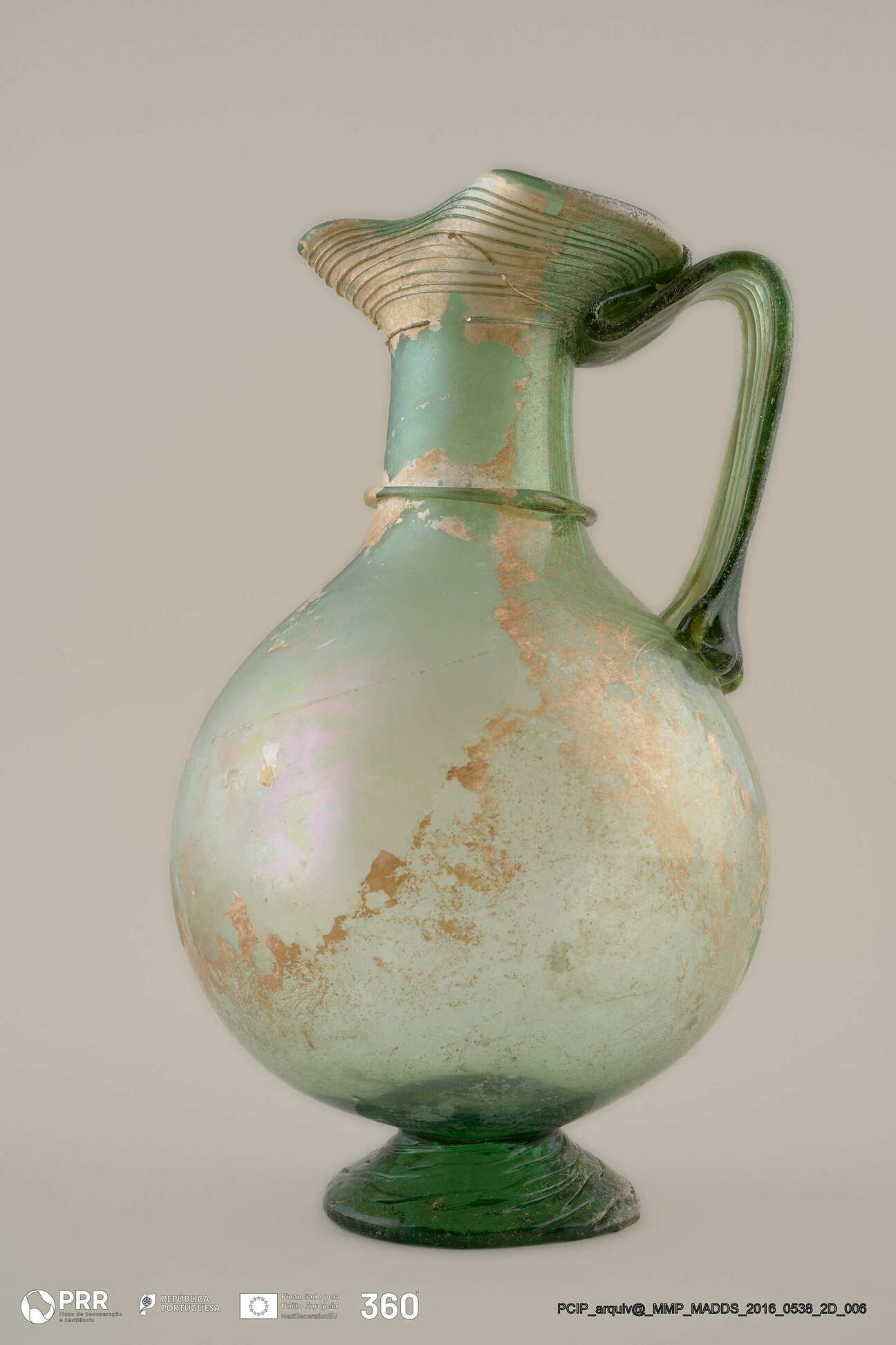 Matéria/Técnica: Vidro; Cronologia: Século V d.C; Autoria: Desconhecida; Dimensões (cm): 25 x 15 x 15.