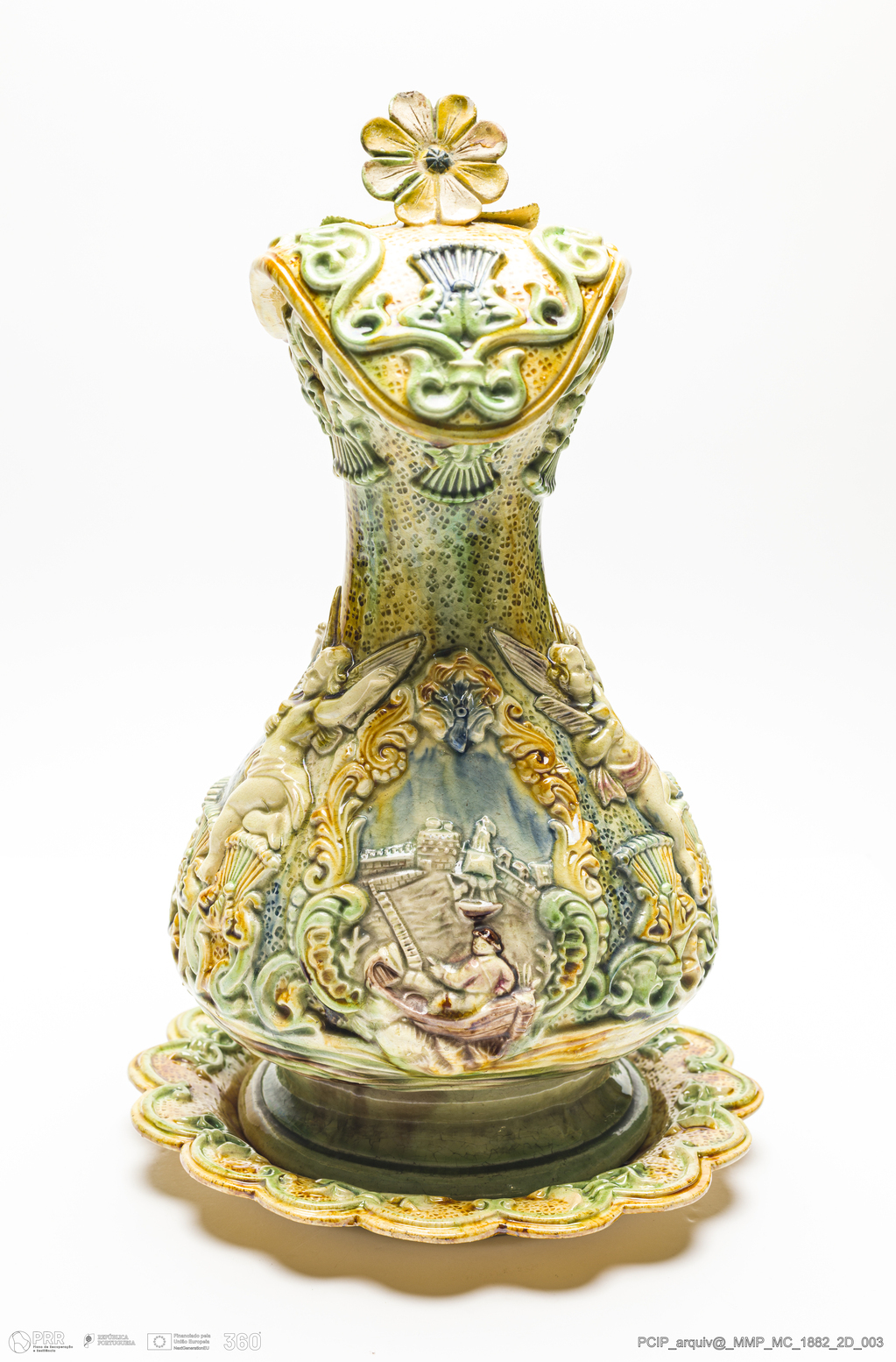 Matéria/Técnica: Barro branco moldado e modelado. Vidrado polícromo: castanho escuro e mel, cinzento, azul, verde, amarelo e camurça; Cronologia: 1895-1901; Autoria: José Alves Cunha / Fábrica De José Alves Cunha, Caldas da Rainha; Dimensões (cm): Altura: 37,5; Largura: 22; Comprimento: 23.