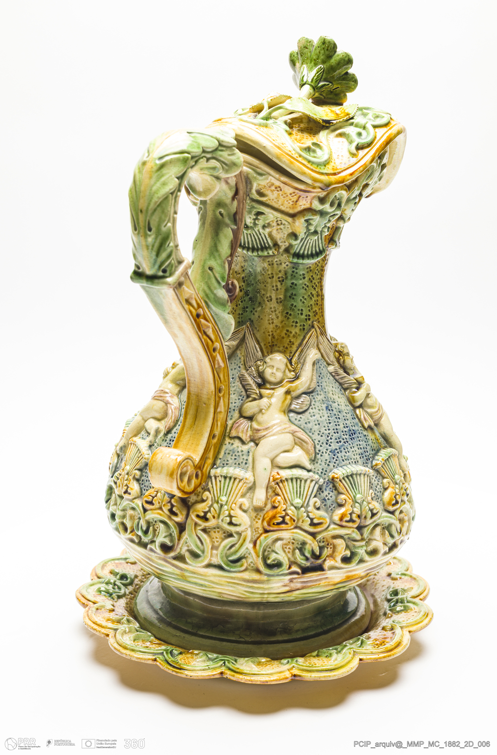 Matéria/Técnica: Barro branco moldado e modelado. Vidrado polícromo: castanho escuro e mel, cinzento, azul, verde, amarelo e camurça; Cronologia: 1895-1901; Autoria: José Alves Cunha / Fábrica De José Alves Cunha, Caldas da Rainha; Dimensões (cm): Altura: 37,5; Largura: 22; Comprimento: 23.