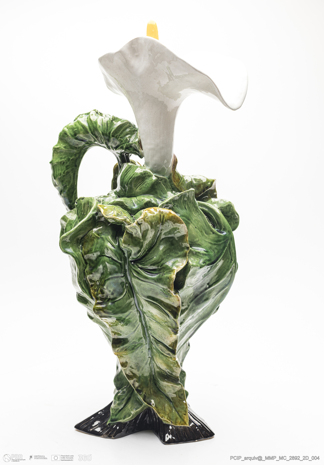 Matéria/Técnica: Barro vermelho moldado e modelado. Vidrado polícromo: verde, castanho mel e branco; Cronologia: século XX; Autoria: Manuel Gustavo Bordalo Pinheiro / Fábrica de Faianças das Caldas da Rainha, Portugal; Dimensões (cm): Altura: 46; Largura: 23.