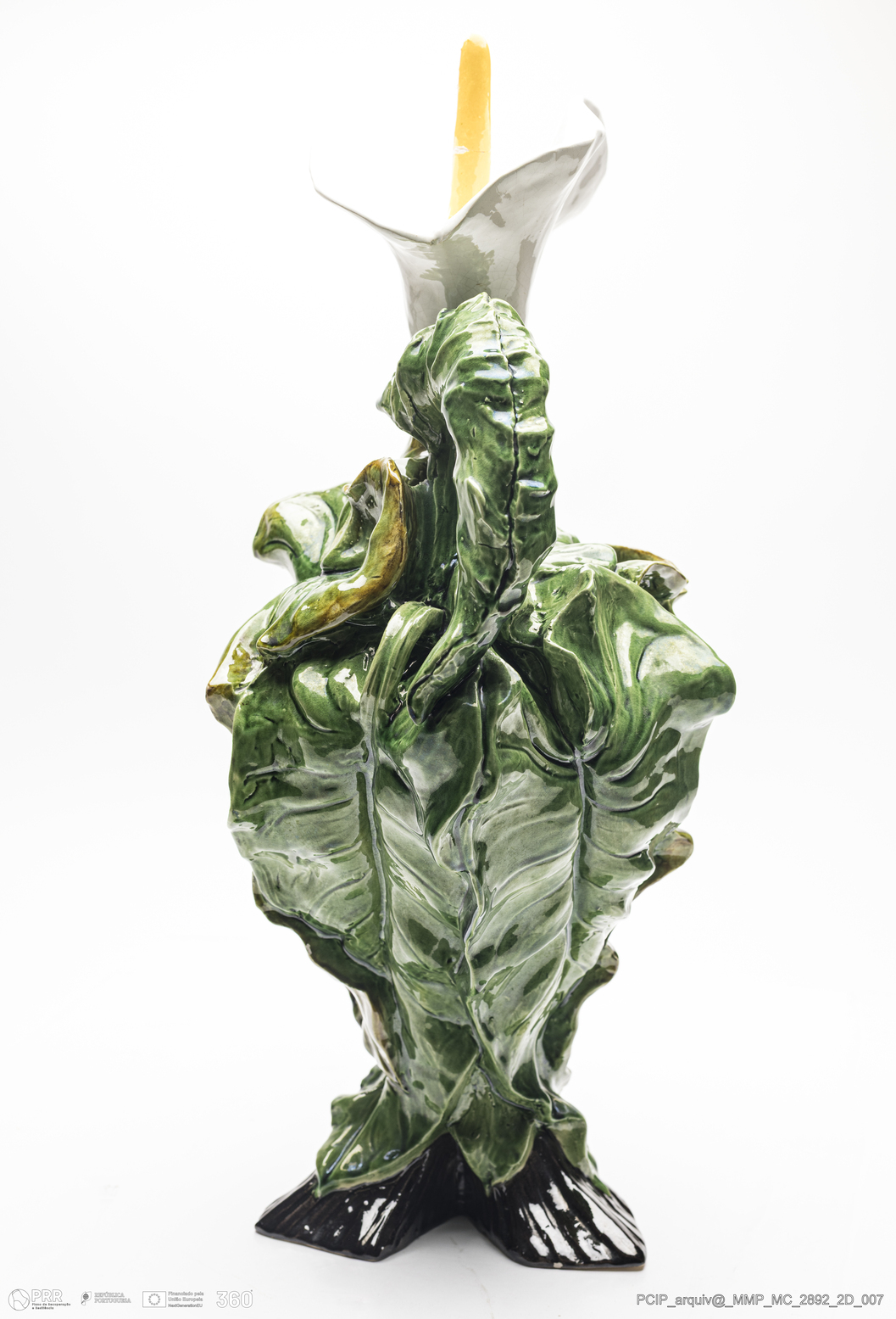 Matéria/Técnica: Barro vermelho moldado e modelado. Vidrado polícromo: verde, castanho mel e branco; Cronologia: século XX; Autoria: Manuel Gustavo Bordalo Pinheiro / Fábrica de Faianças das Caldas da Rainha, Portugal; Dimensões (cm): Altura: 46; Largura: 23.