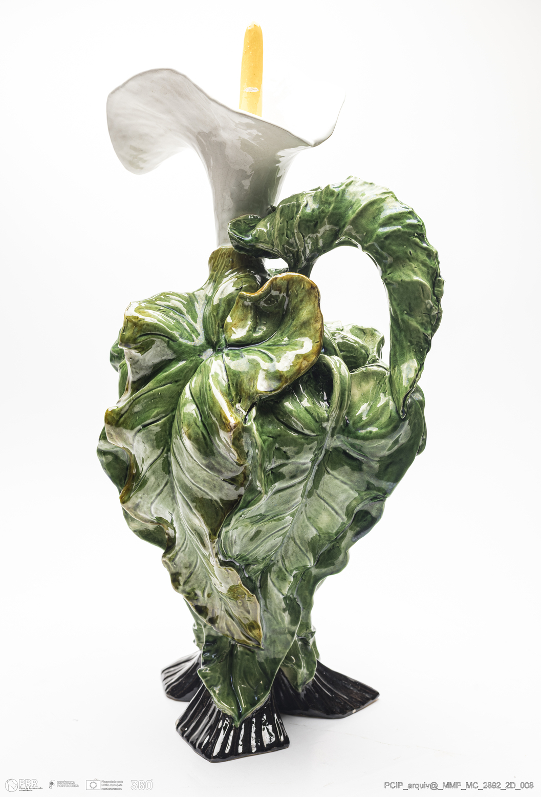 Matéria/Técnica: Barro vermelho moldado e modelado. Vidrado polícromo: verde, castanho mel e branco; Cronologia: século XX; Autoria: Manuel Gustavo Bordalo Pinheiro / Fábrica de Faianças das Caldas da Rainha, Portugal; Dimensões (cm): Altura: 46; Largura: 23.