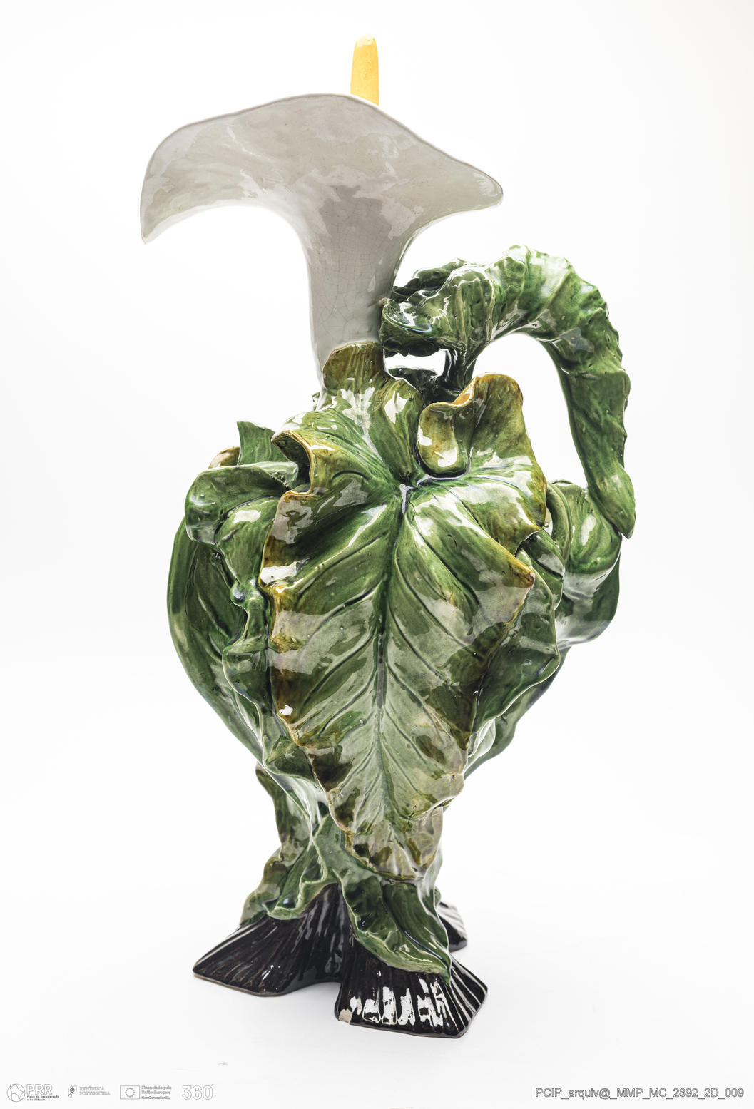 Matéria/Técnica: Barro vermelho moldado e modelado. Vidrado polícromo: verde, castanho mel e branco; Cronologia: século XX; Autoria: Manuel Gustavo Bordalo Pinheiro / Fábrica de Faianças das Caldas da Rainha, Portugal; Dimensões (cm): Altura: 46; Largura: 23.