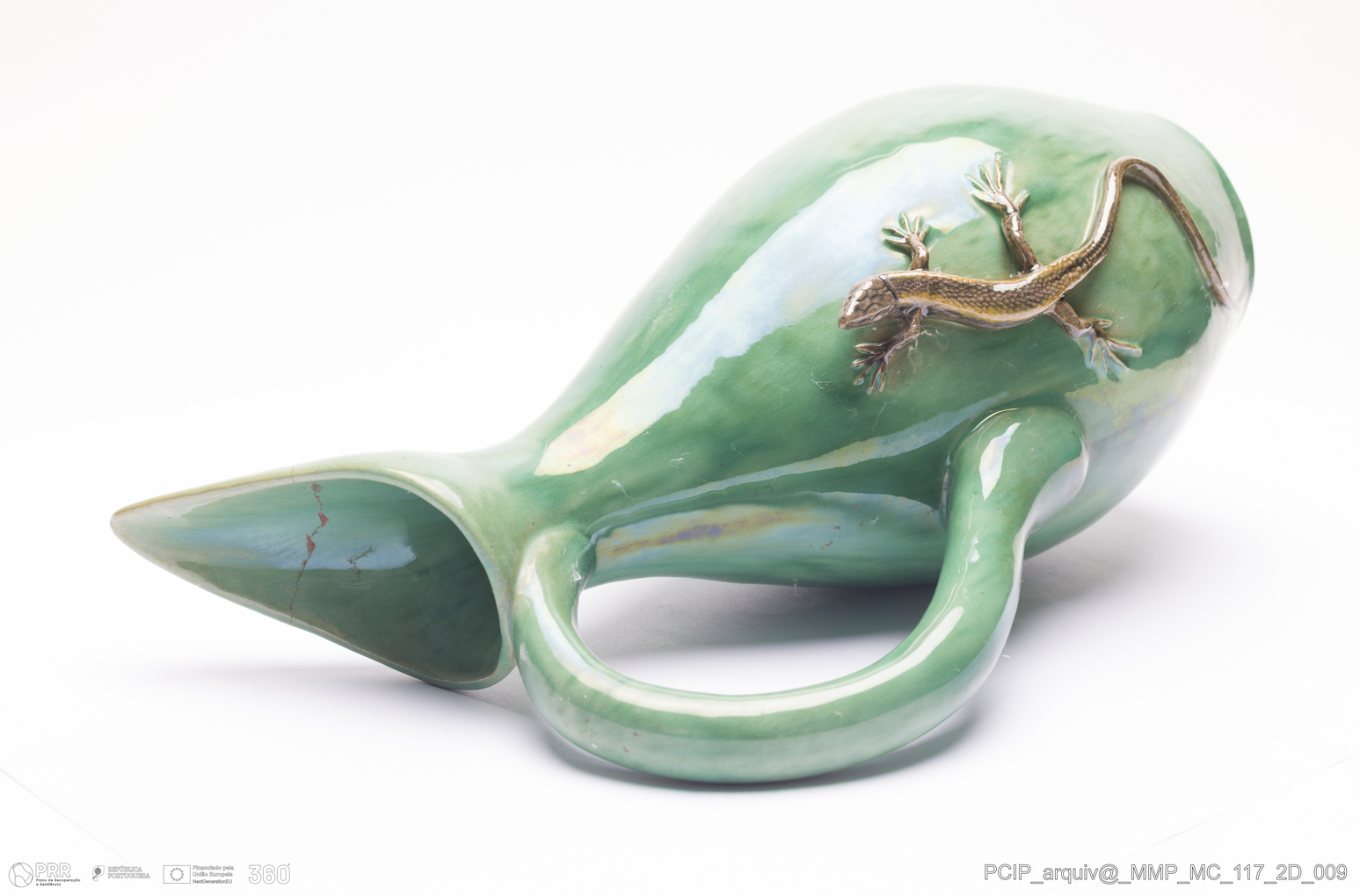 Matéria/Técnica: Barro vermelho moldado e modelado. Vidrado polícromo: cinzento e verde; Cronologia: 1911; Autoria: Manuel Gustavo Bordalo Pinheiro / Fábrica Bordalo Pinheiro, Caldas da Rainha, Portugal; Dimensões (cm): Altura: 32,8; Largura: 23; Comprimento: 19.