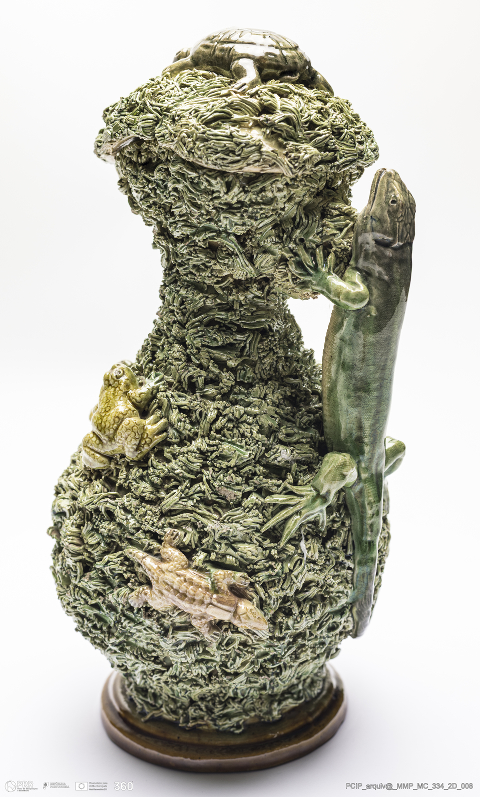 Matéria/Técnica: Barro vermelho moldado e modelado. Vidrado polícromo: verde de cobre, amarelo de ferro e azul cobalto. Musgado; Cronologia: 1853-1870; Autoria: Manuel Cipriano Gomes Mafra / Fábrica de Manuel Cipriano Gomes O Mafra, Caldas da Rainha, Portugal; Dimensões (cm): Altura: 28; Largura: 14; Comprimento: 15.