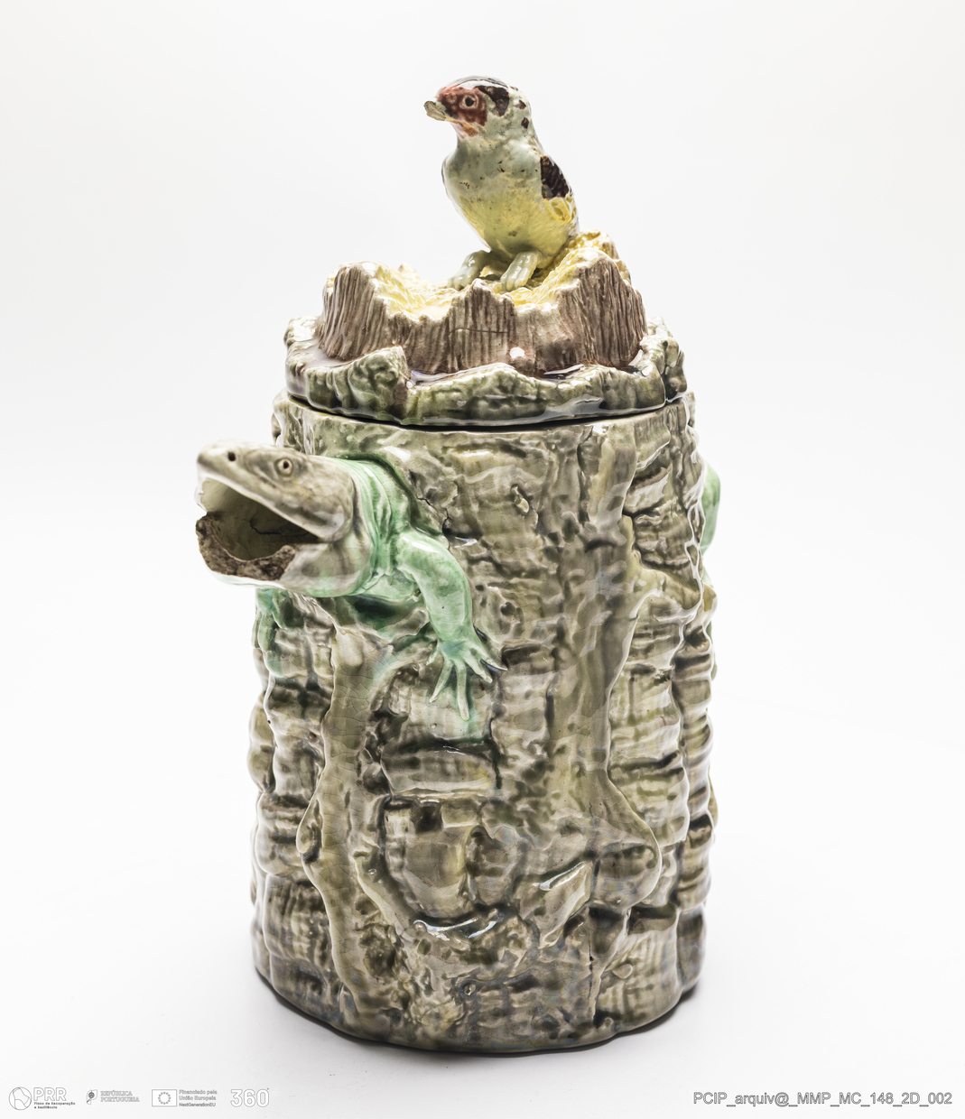 Matéria/Técnica: Barro branco moldado e modelado. Vidrado polícromo; castanho escuro e mel, verde, vermelho, amarelo e camurça; Cronologia: 1900; Autoria: Rafael Bordalo Pinheiro / Fábrica de Faianças das Caldas da Rainha, Portugal; Dimensões (cm): Altura: 24; Largura: 15; Comprimento: 25.