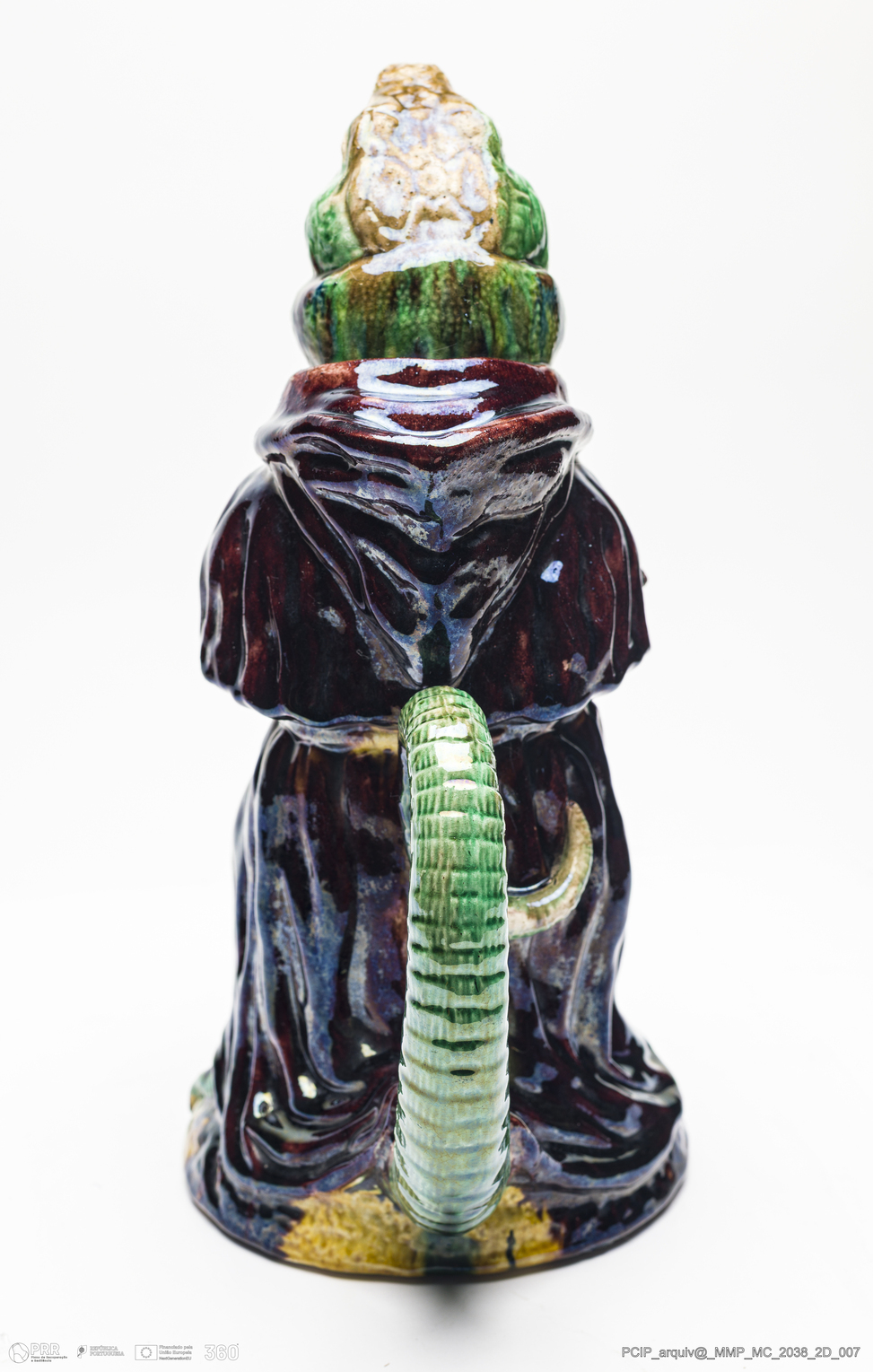 Matéria/Técnica: Barro modelado. Vidrado polícromo: castanho escuro e mel, verde, vermelho e amarelo; Cronologia: 1870-1890; Autoria: Desconhecido / Fábrica de Faianças das Caldas da Rainha, Caldas da Rainha, Portugal; Dimensões (cm): Altura: 34; Largura: 16; Comprimento: 21,5.