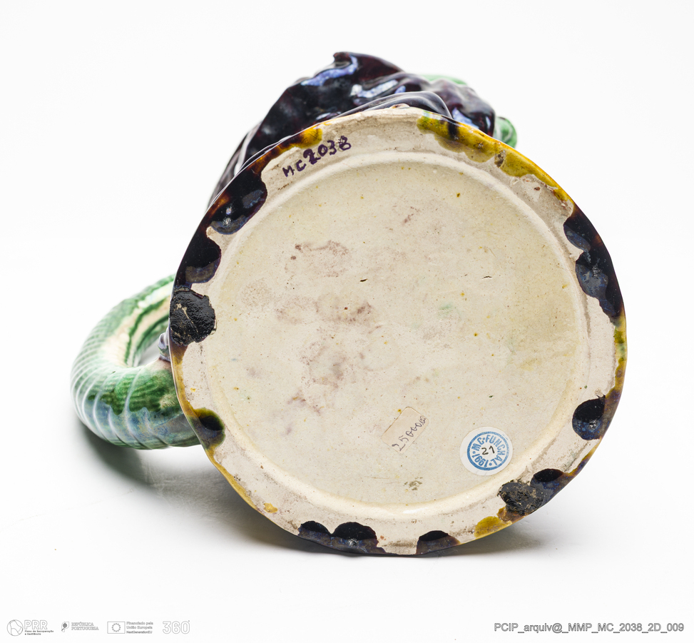 Matéria/Técnica: Barro modelado. Vidrado polícromo: castanho escuro e mel, verde, vermelho e amarelo; Cronologia: 1870-1890; Autoria: Desconhecido / Fábrica de Faianças das Caldas da Rainha, Caldas da Rainha, Portugal; Dimensões (cm): Altura: 34; Largura: 16; Comprimento: 21,5.
