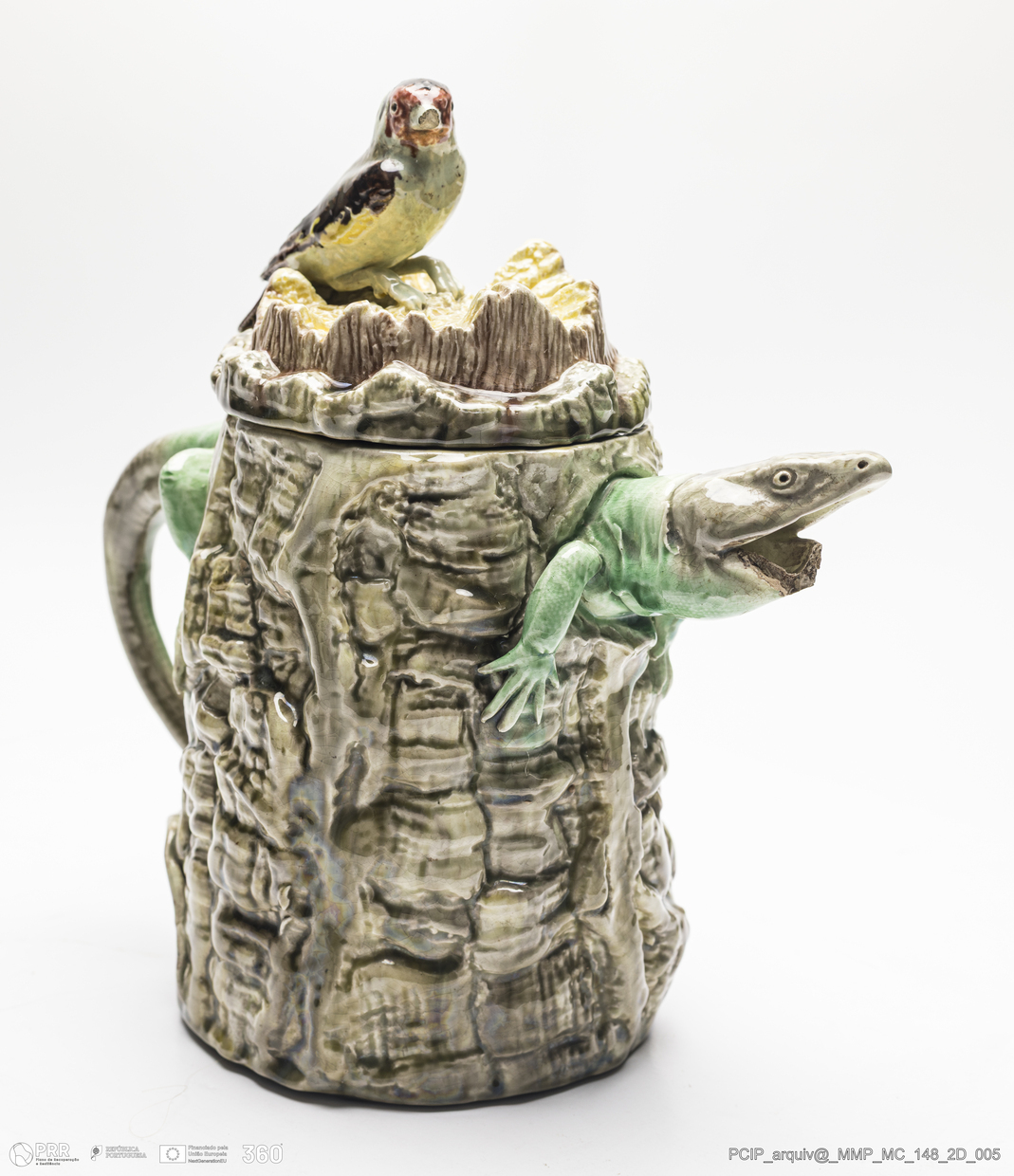 Matéria/Técnica: Barro branco moldado e modelado. Vidrado polícromo; castanho escuro e mel, verde, vermelho, amarelo e camurça; Cronologia: 1900; Autoria: Rafael Bordalo Pinheiro / Fábrica de Faianças das Caldas da Rainha, Portugal; Dimensões (cm): Altura: 24; Largura: 15; Comprimento: 25.