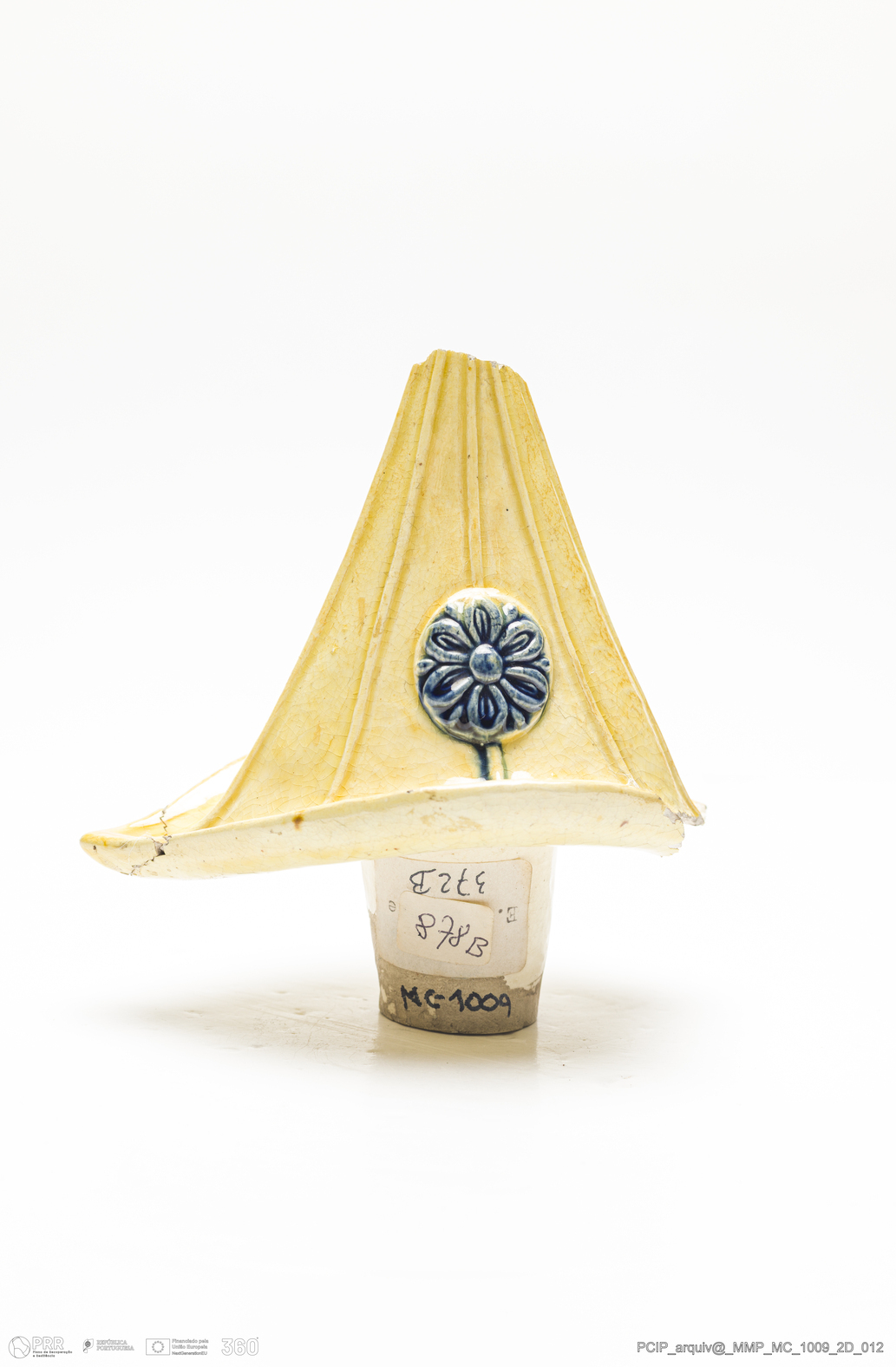 Matéria/Técnica: Barro vermelho moldado e modelado. Vidrado polícromo: camurça, castanho escuro e mel, cinzento, verde e azul; Cronologia: 1902-1925; Autoria: António Alves Cunha / Fábrica de António Alves Cunha, Caldas da Rainha, Portugal; Dimensões (cm): Altura: 33; Largura: 16; Comprimento: 27.