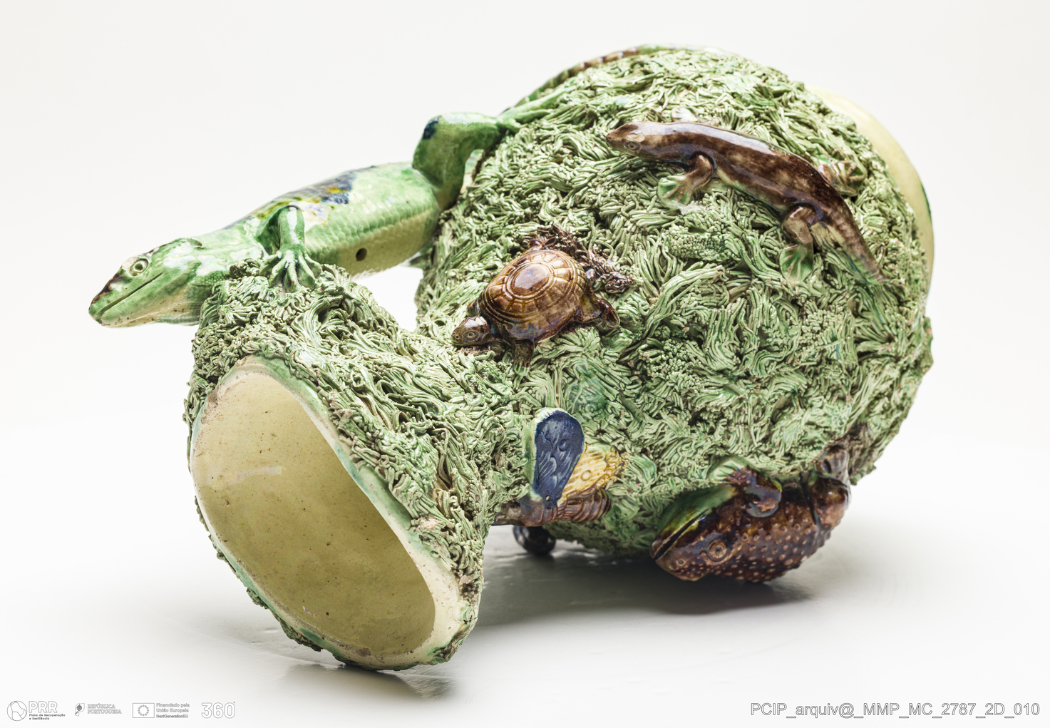 Matéria/Técnica: Barro moldado e modelado. Vidrado polícromo: castanho escuro e mel, verde seco e água, azul e amarelo; Cronologia: 1870-1887; Autoria: Manuel Cipriano Gomes Mafra / Fábrica de Manuel Cipriano Gomes O Mafra, Caldas da Rainha, Portugal; Dimensões (cm): Altura: 34,7; Largura: 18; Comprimento: 18.