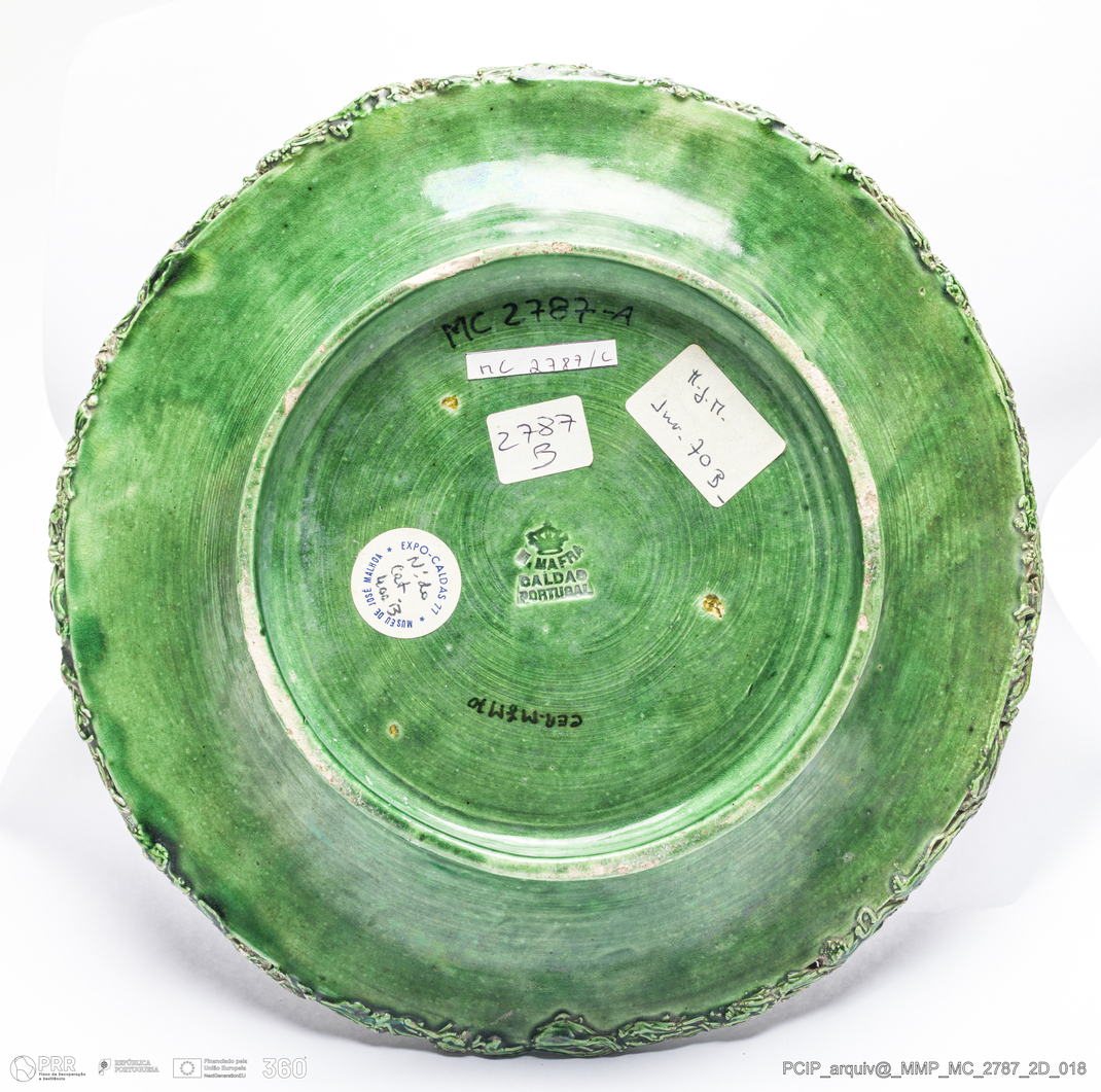 Matéria/Técnica: Barro moldado e modelado. Vidrado polícromo: castanho escuro e mel, verde seco e água, azul e amarelo; Cronologia: 1870-1887; Autoria: Manuel Cipriano Gomes Mafra / Fábrica de Manuel Cipriano Gomes O Mafra, Caldas da Rainha, Portugal; Dimensões (cm): Altura: 34,7; Largura: 18; Comprimento: 18.