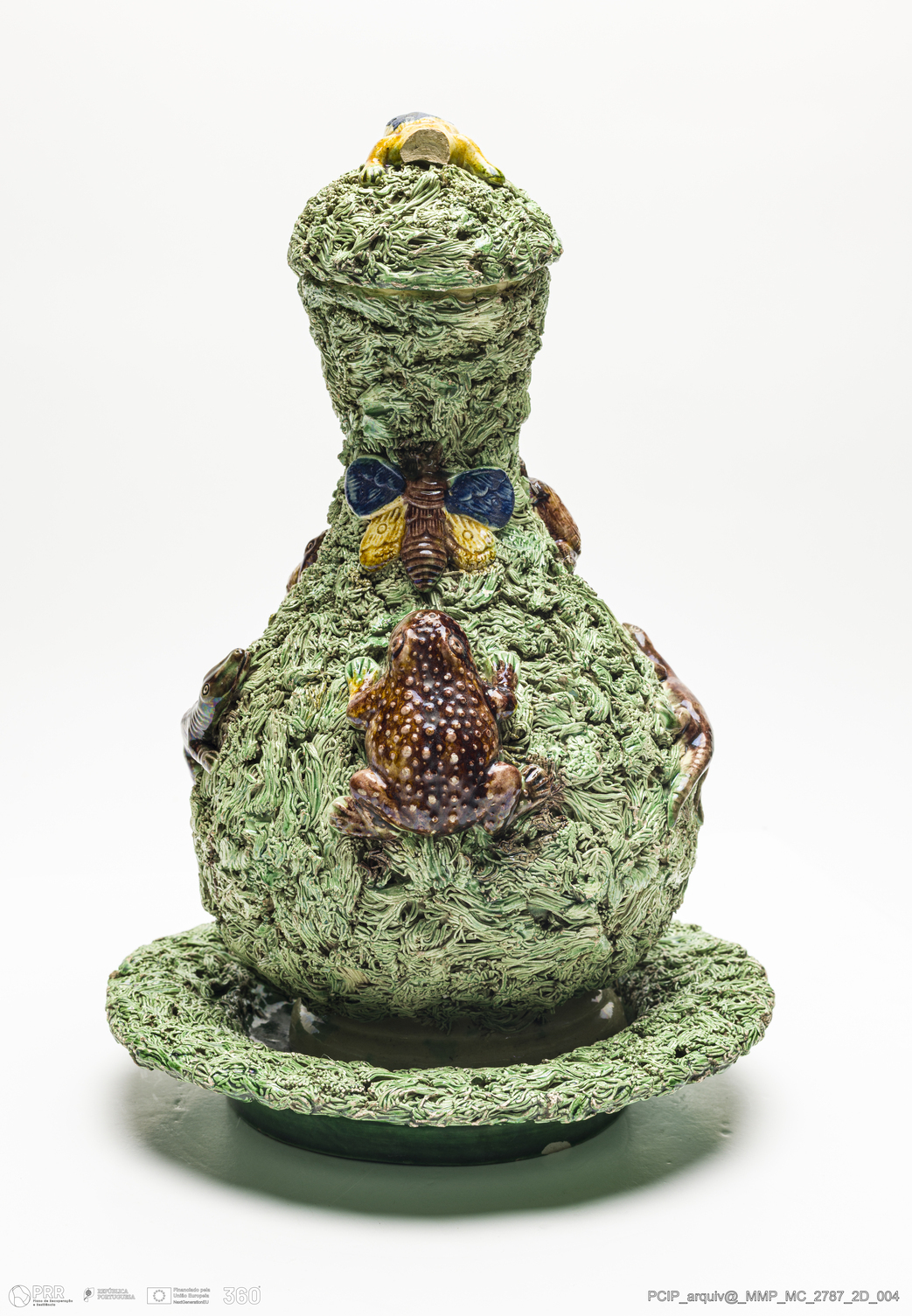 Matéria/Técnica: Barro moldado e modelado. Vidrado polícromo: castanho escuro e mel, verde seco e água, azul e amarelo; Cronologia: 1870-1887; Autoria: Manuel Cipriano Gomes Mafra / Fábrica de Manuel Cipriano Gomes O Mafra, Caldas da Rainha, Portugal; Dimensões (cm): Altura: 34,7; Largura: 18; Comprimento: 18.