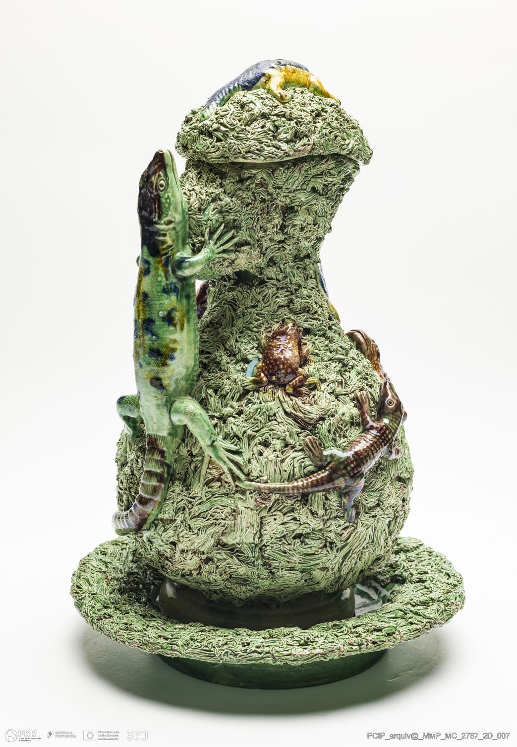 Matéria/Técnica: Barro moldado e modelado. Vidrado polícromo: castanho escuro e mel, verde seco e água, azul e amarelo; Cronologia: 1870-1887; Autoria: Manuel Cipriano Gomes Mafra / Fábrica de Manuel Cipriano Gomes O Mafra, Caldas da Rainha, Portugal; Dimensões (cm): Altura: 34,7; Largura: 18; Comprimento: 18.