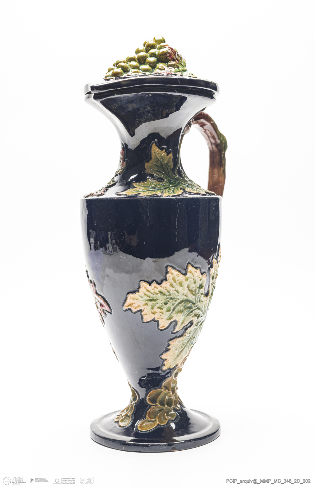 Matéria/Técnica: Barro vermelho modelado e moldado. Vidrado polícromo: azul, verde, castanho e amarelo; Cronologia: 1907; Autoria: Manuel Gustavo Bordalo Pinheiro / Fábrica de Faianças das Caldas da Rainha, Portugal; Dimensões (cm): Altura: 26; Largura: 15.