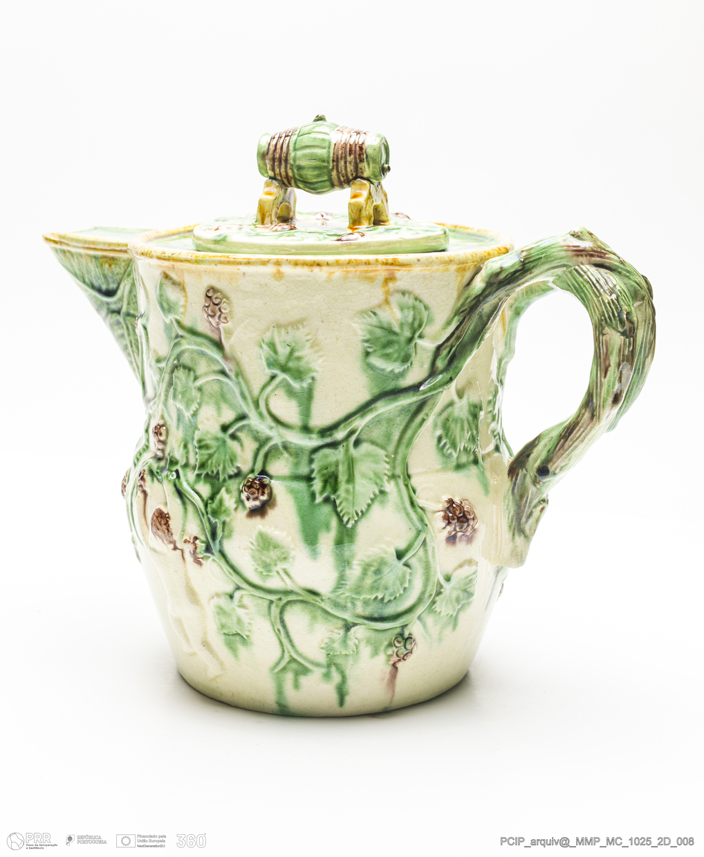 Matéria/Técnica: Barro moldado e modelado. Vidrado polícromo: branco anilado, castanho e verde; Cronologia: 1860-1907; Autoria: José Francisco de Sousa/ Fábrica de José Francisco de Sousa, Caldas da Rainha, Portugal; Dimensões (cm): Altura: 21; Largura: 15; Comprimento: 25.