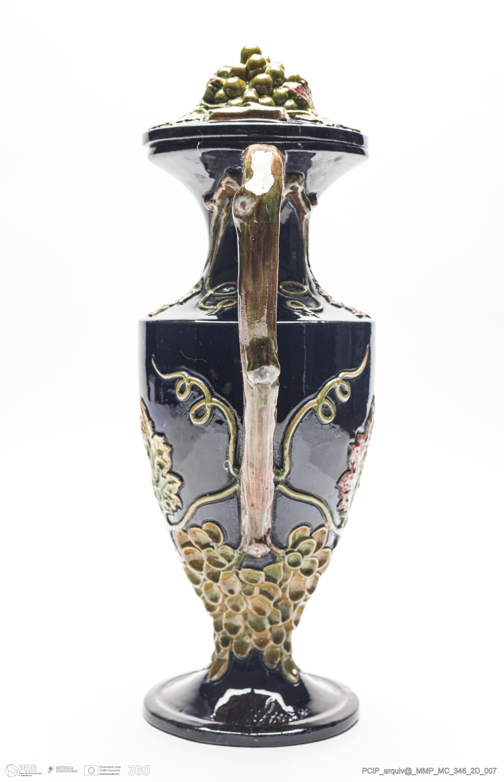 Matéria/Técnica: Barro vermelho modelado e moldado. Vidrado polícromo: azul, verde, castanho e amarelo; Cronologia: 1907; Autoria: Manuel Gustavo Bordalo Pinheiro / Fábrica de Faianças das Caldas da Rainha, Portugal; Dimensões (cm): Altura: 26; Largura: 15.