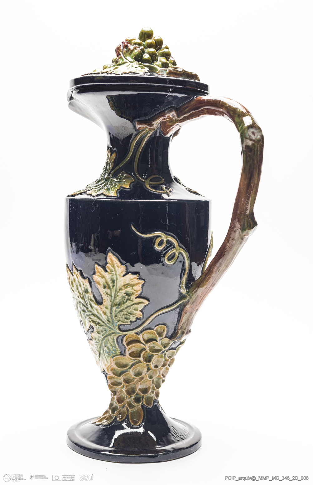 Matéria/Técnica: Barro vermelho modelado e moldado. Vidrado polícromo: azul, verde, castanho e amarelo; Cronologia: 1907; Autoria: Manuel Gustavo Bordalo Pinheiro / Fábrica de Faianças das Caldas da Rainha, Portugal; Dimensões (cm): Altura: 26; Largura: 15.