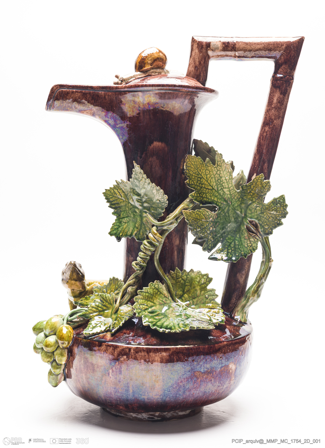 Matéria/Técnica: Barro branco moldado e modelado. Vidrado polícromo: castanho escuro e mel, verdes e acinzentado; Cronologia: 1902-1925; Autoria: António Alves da Cunha / Fábrica De António Alves da Cunha, Caldas da Rainha, Portugal; Dimensões (cm): Altura: 38; Largura: 26; Comprimento: 22.
