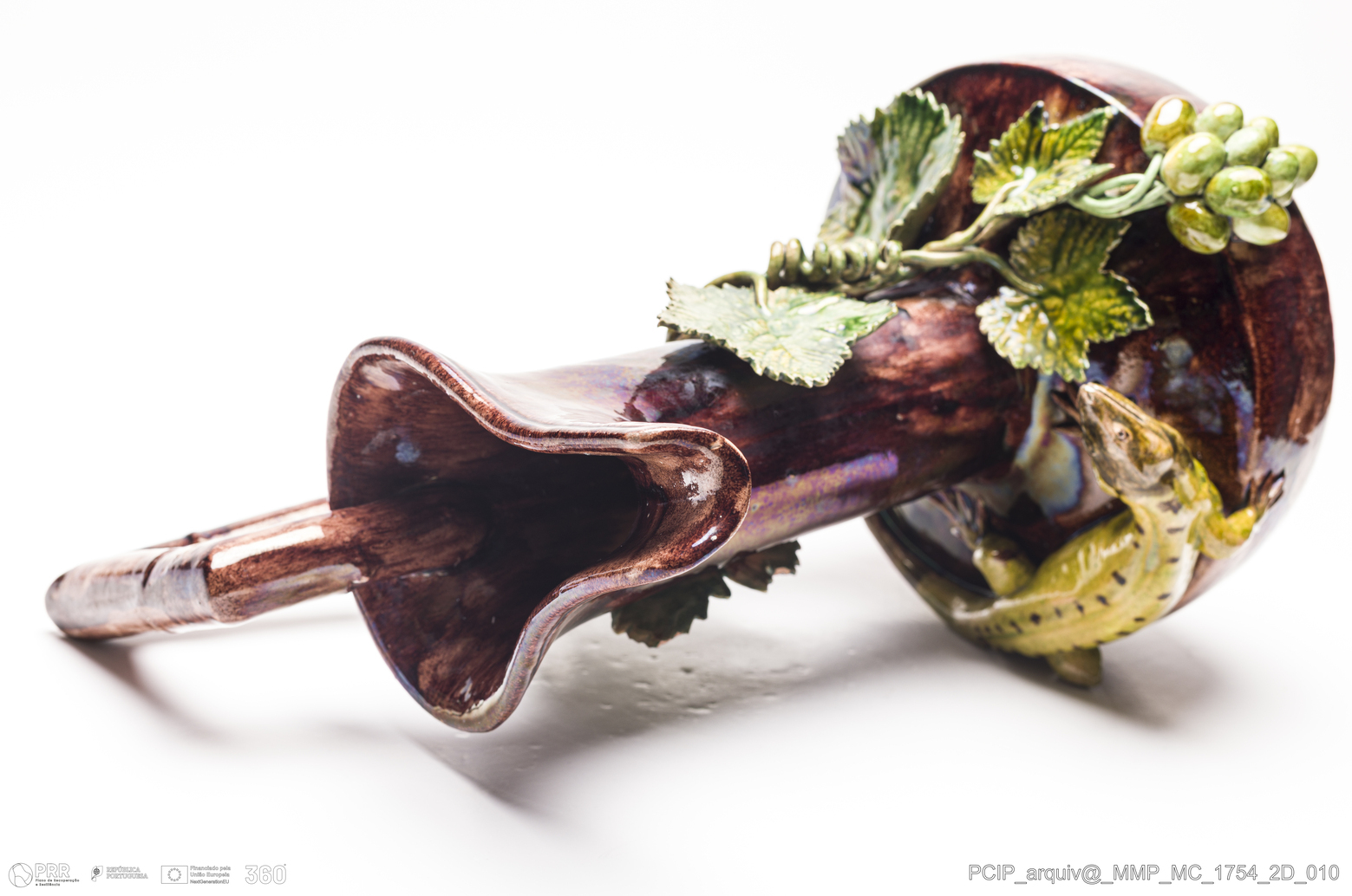 Matéria/Técnica: Barro branco moldado e modelado. Vidrado polícromo: castanho escuro e mel, verdes e acinzentado; Cronologia: 1902-1925; Autoria: António Alves da Cunha / Fábrica De António Alves da Cunha, Caldas da Rainha, Portugal; Dimensões (cm): Altura: 38; Largura: 26; Comprimento: 22.