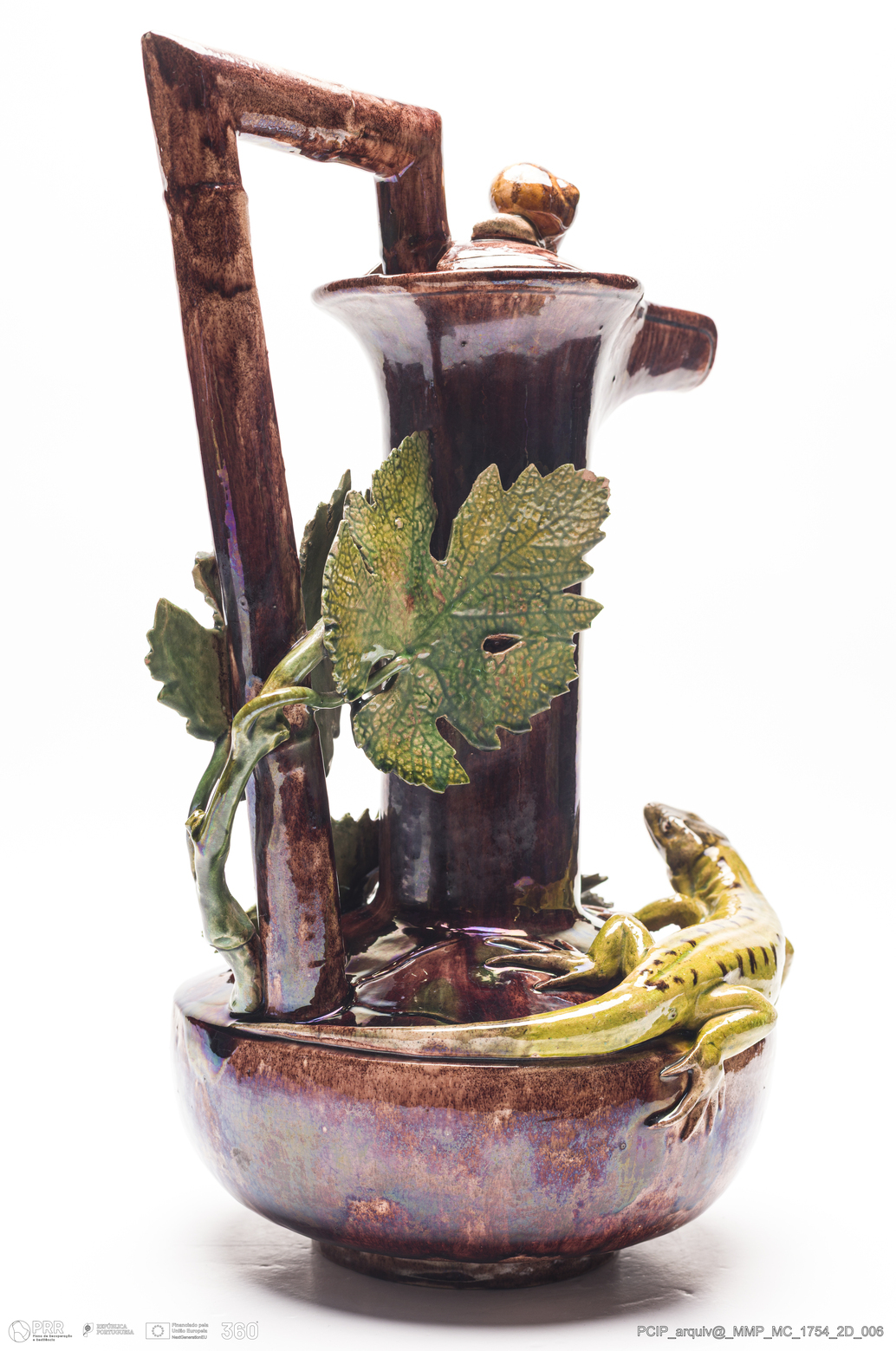 Matéria/Técnica: Barro branco moldado e modelado. Vidrado polícromo: castanho escuro e mel, verdes e acinzentado; Cronologia: 1902-1925; Autoria: António Alves da Cunha / Fábrica De António Alves da Cunha, Caldas da Rainha, Portugal; Dimensões (cm): Altura: 38; Largura: 26; Comprimento: 22.