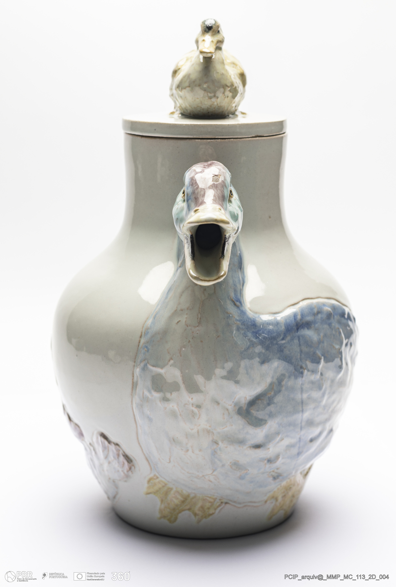 Matéria/Técnica: Barro vermelho moldado e modelado. Vidrado polícromo: branco, azul, rosa e amarelo; Cronologia: 1906; Autoria: Manuel Gustavo Bordalo Pinheiro / Fábrica de Faianças das Caldas da Rainha, Portugal; Dimensões (cm): Altura: 26,5; Largura: 28,5; Comprimento: 16.