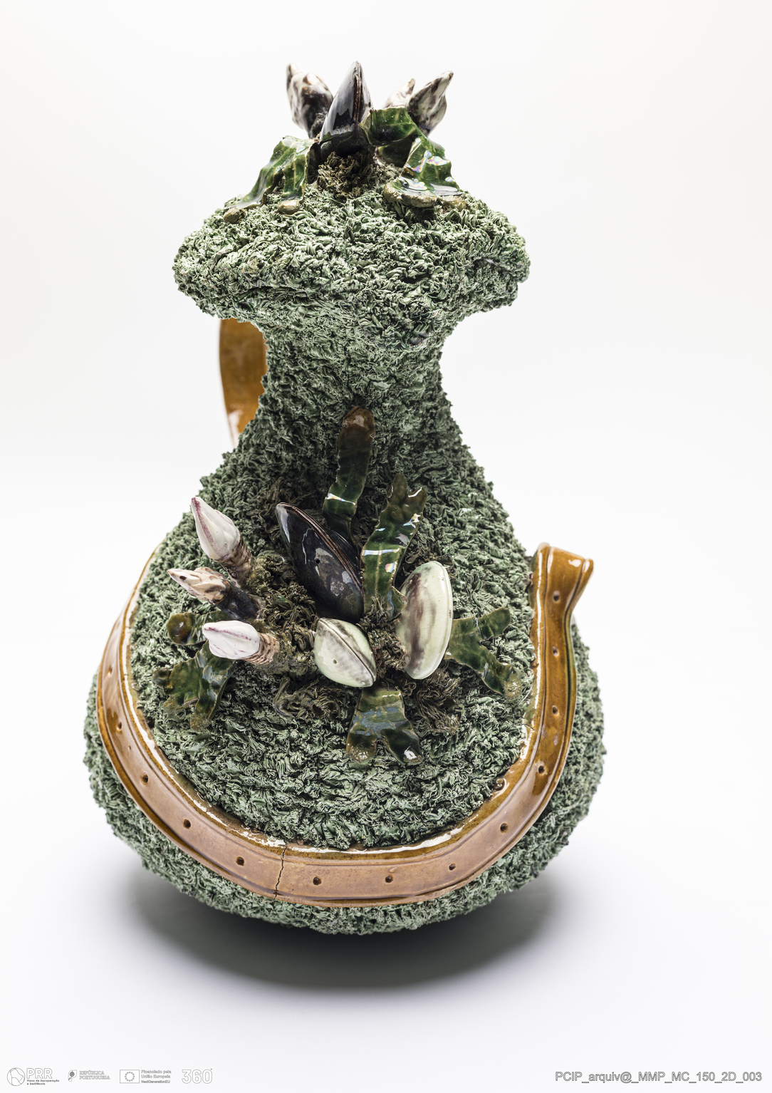 Matéria/Técnica: Barro vermelho rodado, moldado e modelado. Vidrado polícromo: preto, castanho escuro e mel, verde, cinzento e branco. Musgado; Cronologia: 1901; Autoria: Rafael Bordalo Pinheiro / Fábrica de Faianças das Caldas da Rainha, Portugal; Dimensões (cm): Altura: 26,1; Largura: 21,7; Comprimento: 16,4.