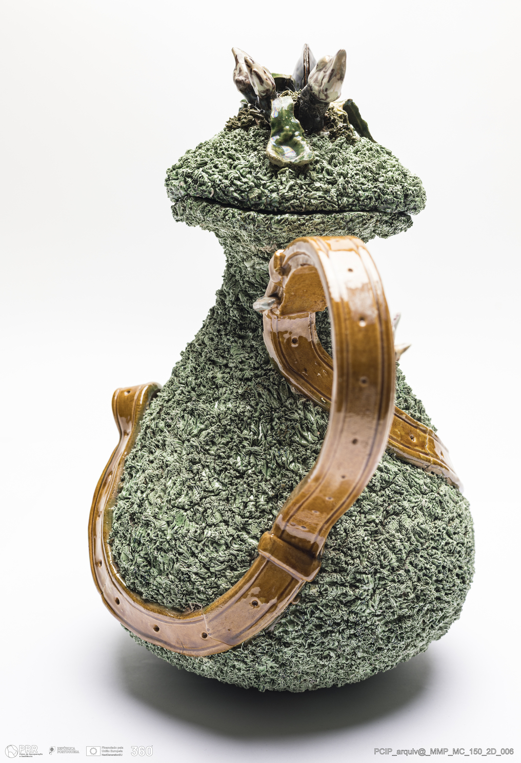 Matéria/Técnica: Barro vermelho rodado, moldado e modelado. Vidrado polícromo: preto, castanho escuro e mel, verde, cinzento e branco. Musgado; Cronologia: 1901; Autoria: Rafael Bordalo Pinheiro / Fábrica de Faianças das Caldas da Rainha, Portugal; Dimensões (cm): Altura: 26,1; Largura: 21,7; Comprimento: 16,4.