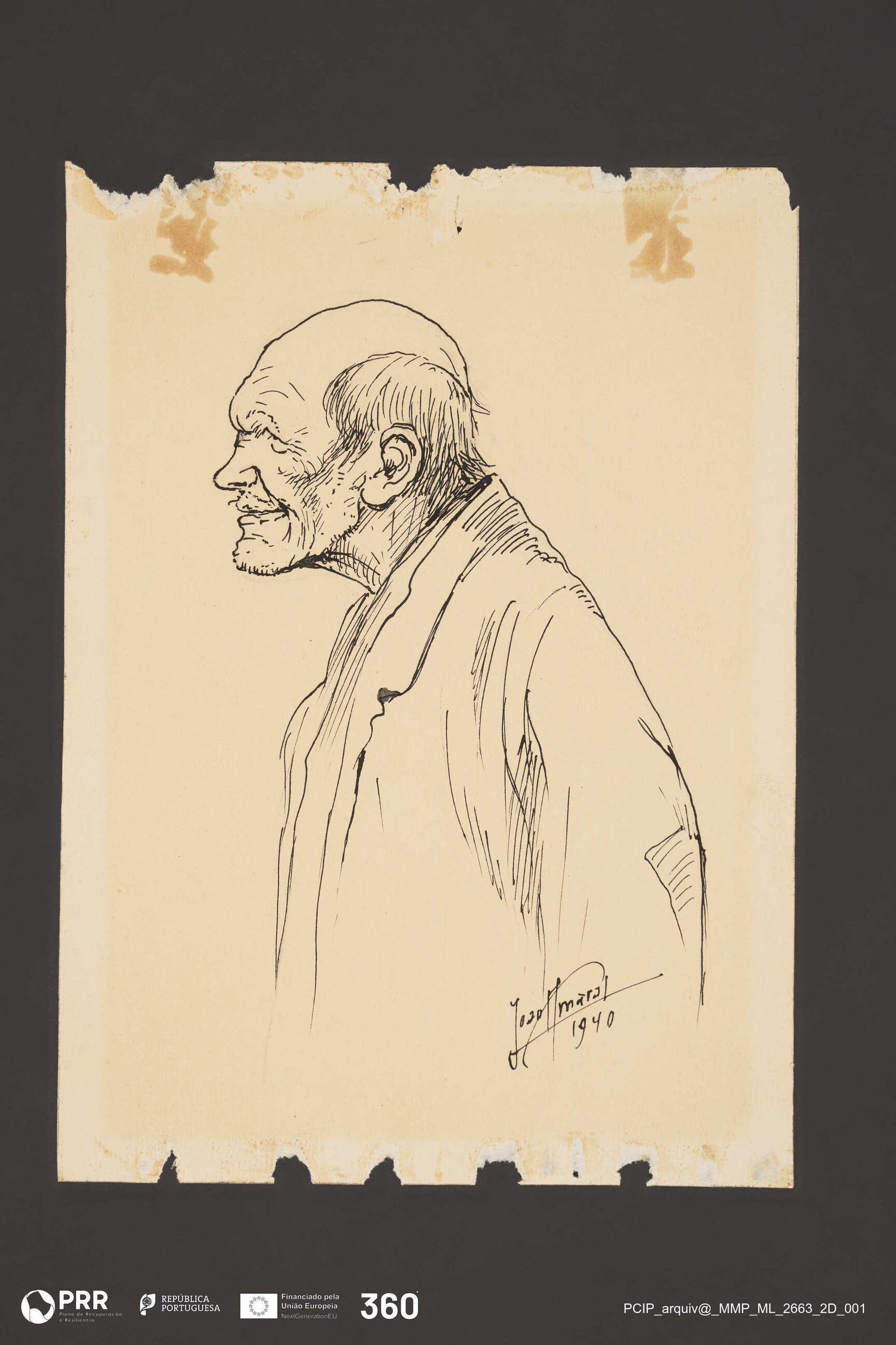 Matéria/Técnica: Desenho à pena; Cronologia: 1940; Autoria: Amaral, João (1874 - 1955); Dimensões (cm): Altura: 19,6 x Largura: 14,1.