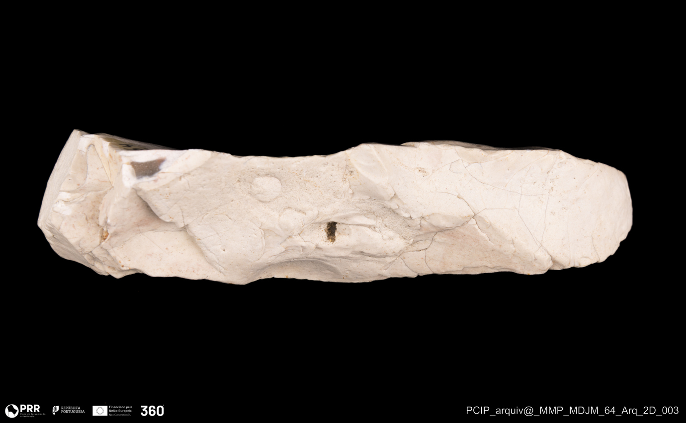 Matéria/Técnica: Pedra calcária; Cronologia: Desconhecida; Autoria: Desconhecida; Dimensões: Altura: 3,6 cm x Largura: 4,3 cm x Comprimento: 11 cm.
