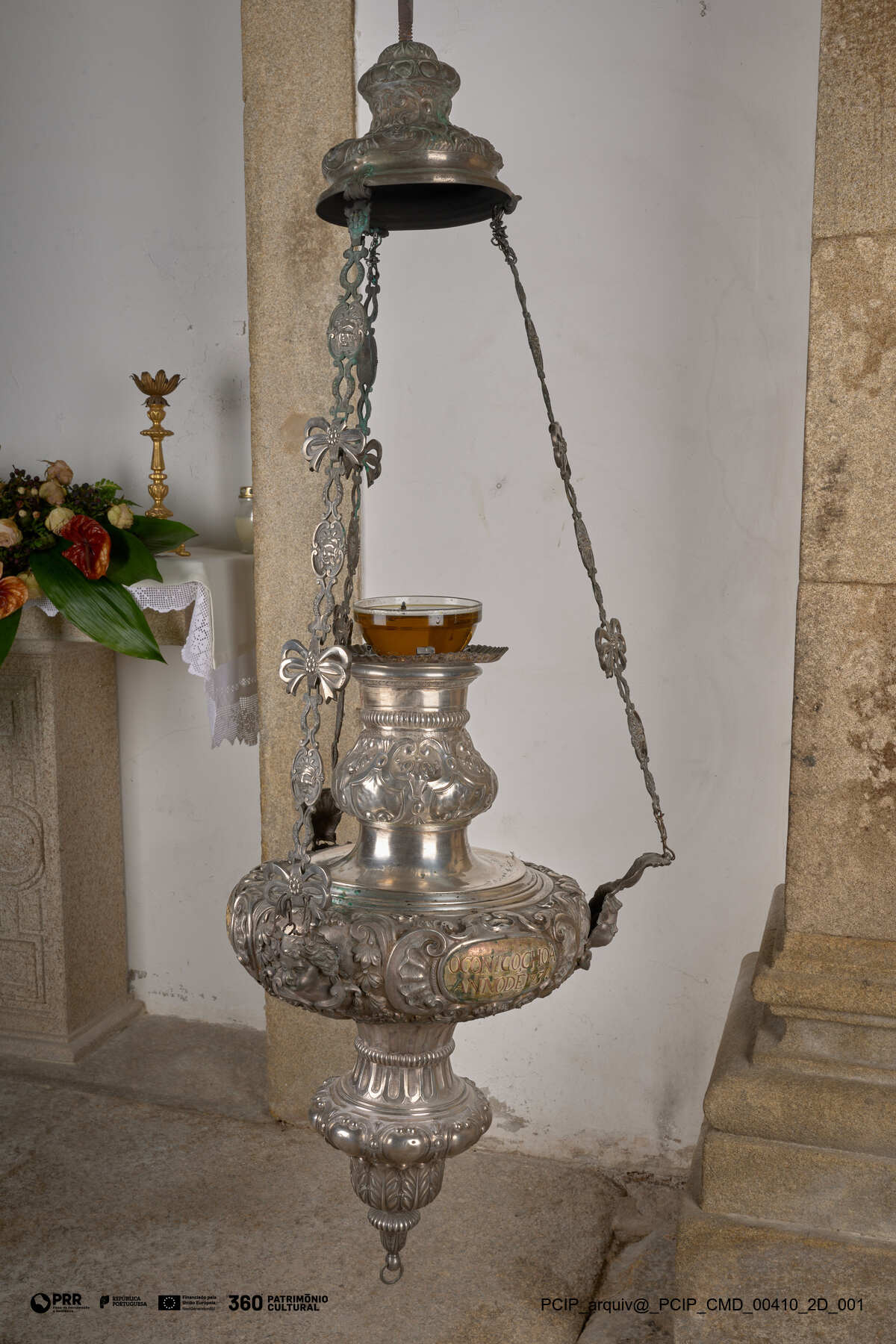 Matéria/Técnica: Prata; Cronologia: 1736; Autoria: Desconhecida; Dimensões: Altura: 135 cm; Largura: 53 cm; Diâmetro: Reservatório 70 cm.