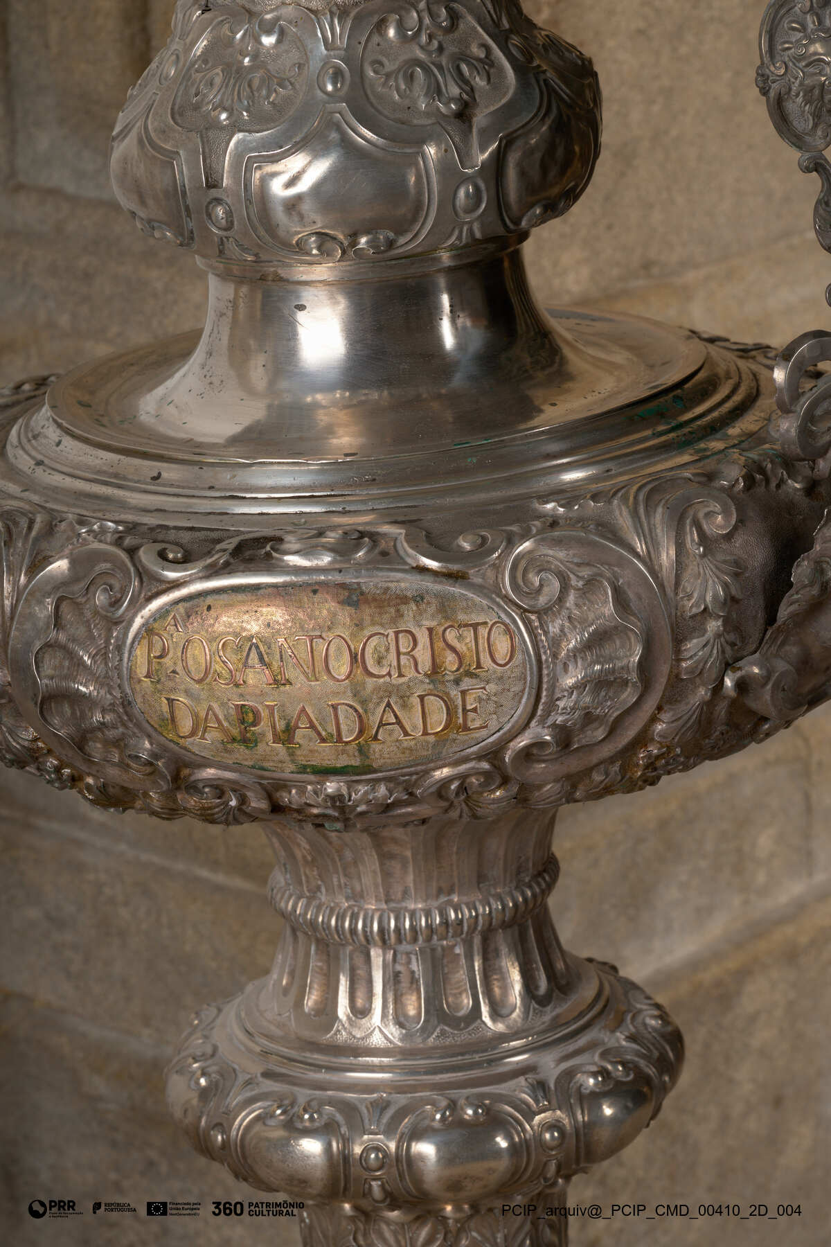 Matéria/Técnica: Prata; Cronologia: 1736; Autoria: Desconhecida; Dimensões: Altura: 135 cm; Largura: 53 cm; Diâmetro: Reservatório 70 cm.