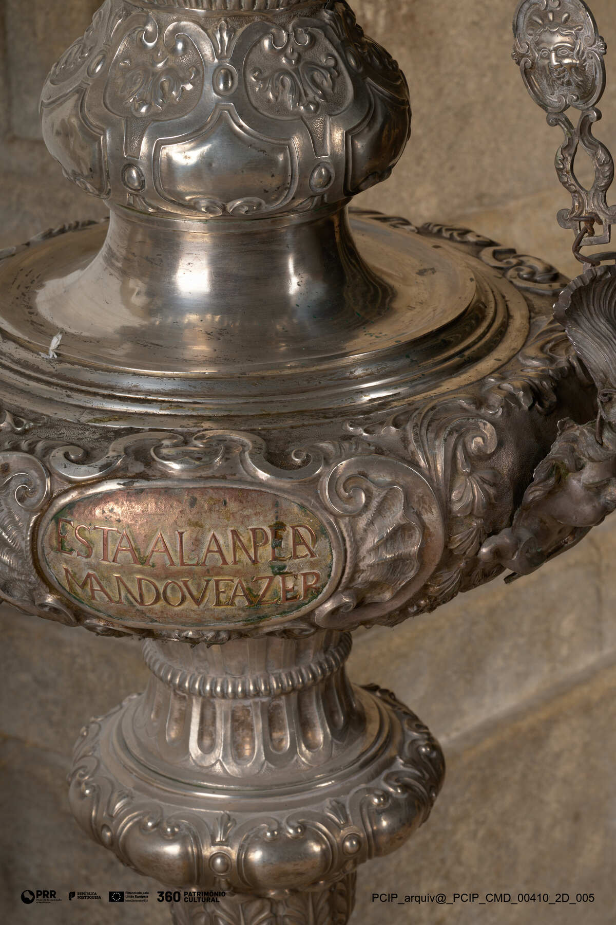 Matéria/Técnica: Prata; Cronologia: 1736; Autoria: Desconhecida; Dimensões: Altura: 135 cm; Largura: 53 cm; Diâmetro: Reservatório 70 cm.
