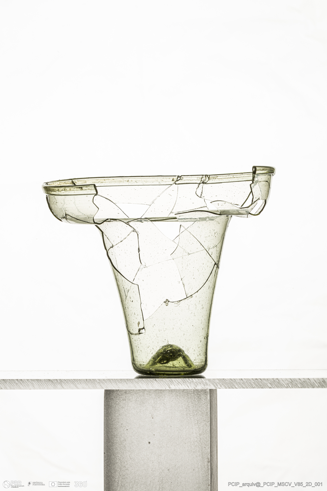 Matéria/Técnica: Vidro; Cronologia: Século XVII; Autoria: Desconhecida; Dimensões: Diâmetro bordo: 110mm; Diâmetro base: 30mm; Altura: 98mm.