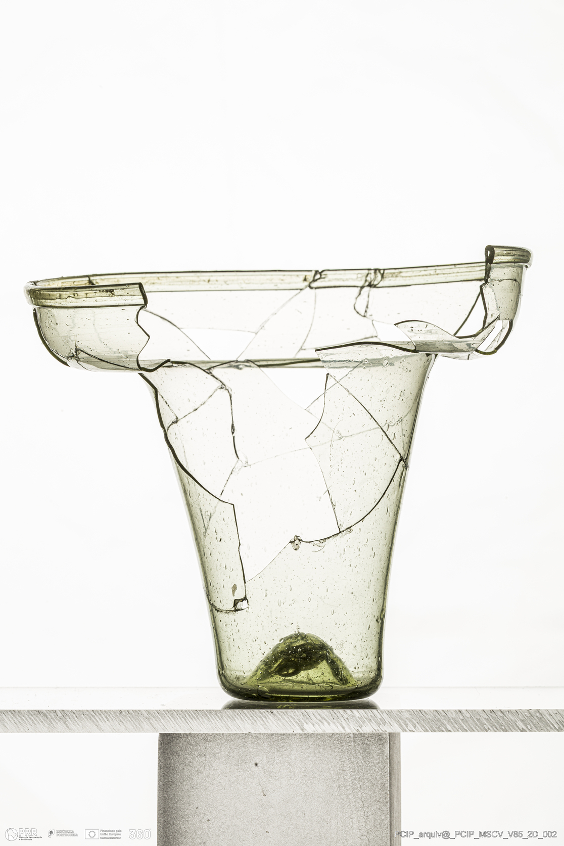 Matéria/Técnica: Vidro; Cronologia: Século XVII; Autoria: Desconhecida; Dimensões: Diâmetro bordo: 110mm; Diâmetro base: 30mm; Altura: 98mm.