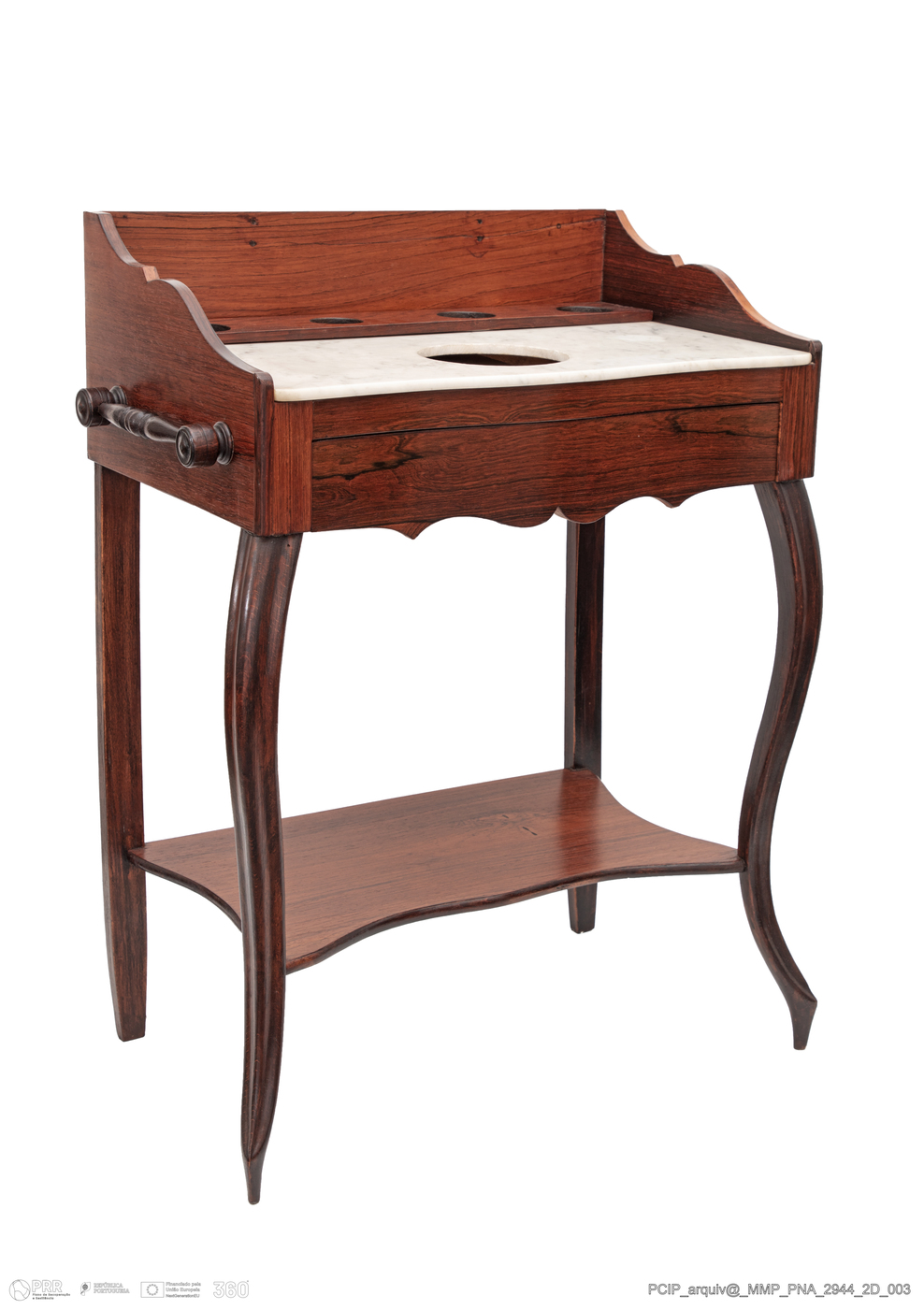 Matéria/Técnica: Madeira de pinho e pau-santo; pedra marmore; Cronologia: Século XIX; Autoria: Desconhecida; Dimensões (cm): Altura: 67,4; Largura: 54; Comprimento: 29.