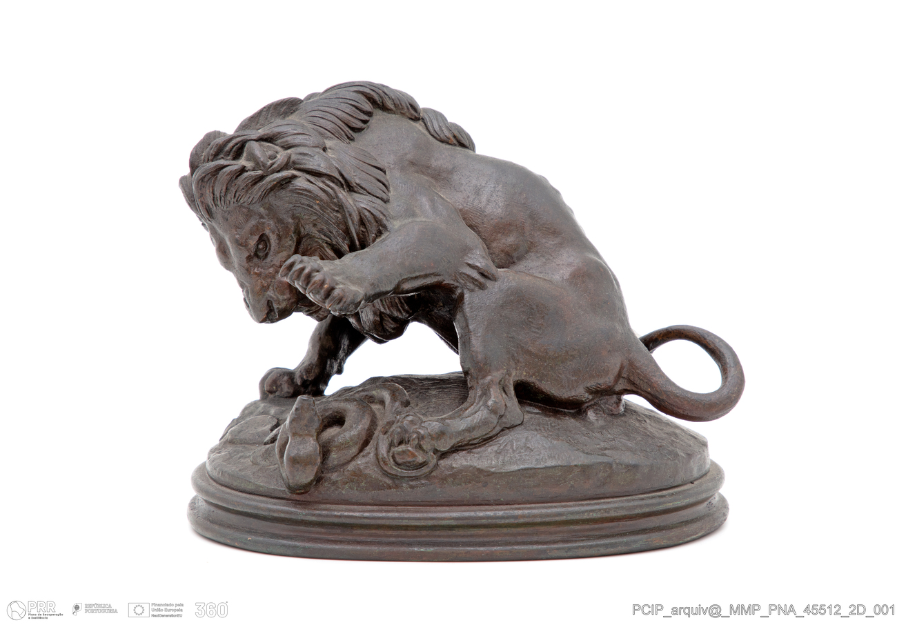 Matéria/Técnica: Bronze; Cronologia: Século XIX; Autoria: Barye, Antoine-Louis (1795-1875); Dimensões: Altura: 12; Largura: 16; Profundidade: 11.