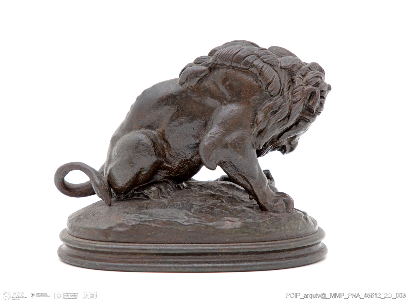 Matéria/Técnica: Bronze; Cronologia: Século XIX; Autoria: Barye, Antoine-Louis (1795-1875); Dimensões (cm): Altura: 12; Largura: 16; Profundidade: 11.