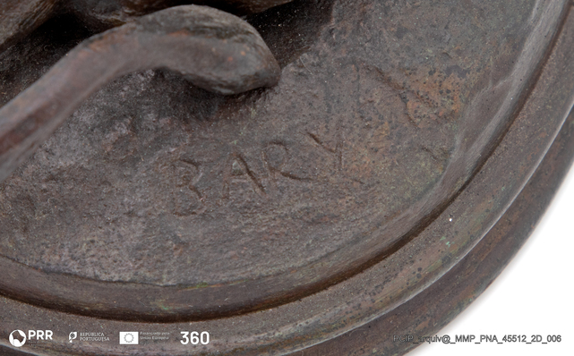 Matéria/Técnica: Bronze; Cronologia: Século XIX; Autoria: Barye, Antoine-Louis (1795-1875); Dimensões (cm): Altura: 12; Largura: 16; Profundidade: 11.