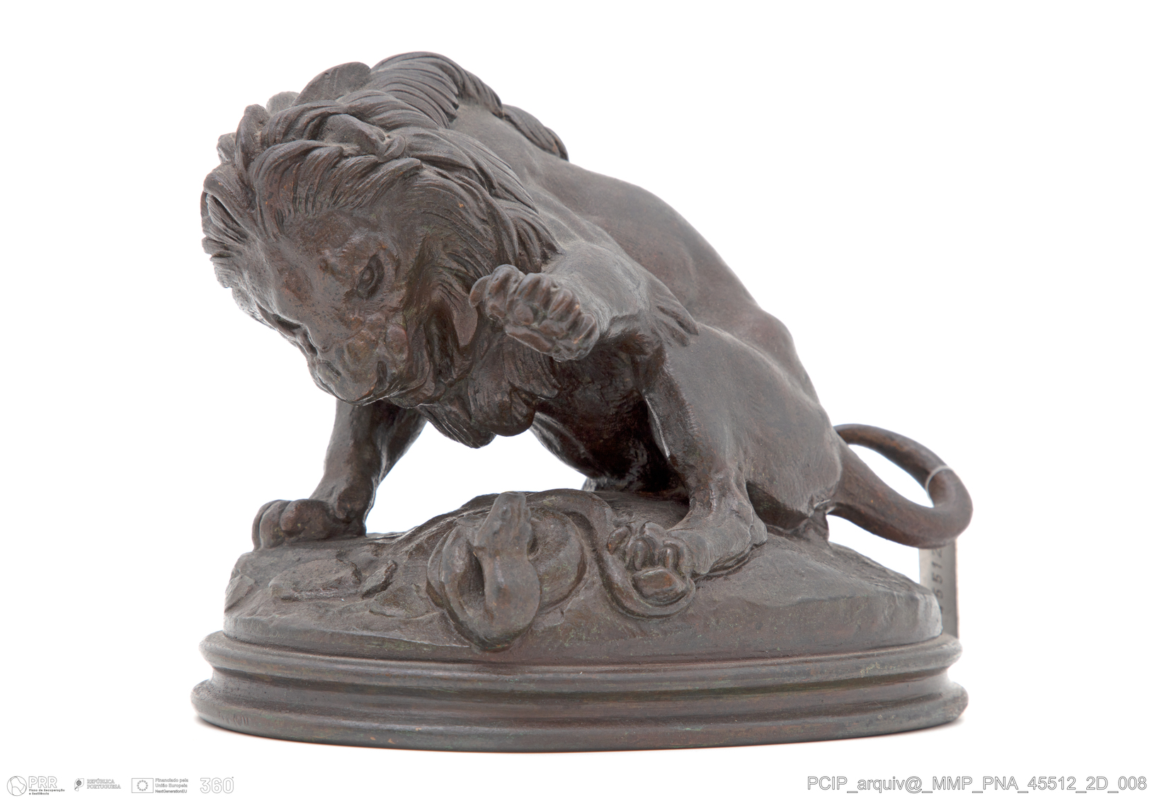 Matéria/Técnica: Bronze; Cronologia: Século XIX; Autoria: Barye, Antoine-Louis (1795-1875); Dimensões (cm): Altura: 12; Largura: 16; Profundidade: 11.