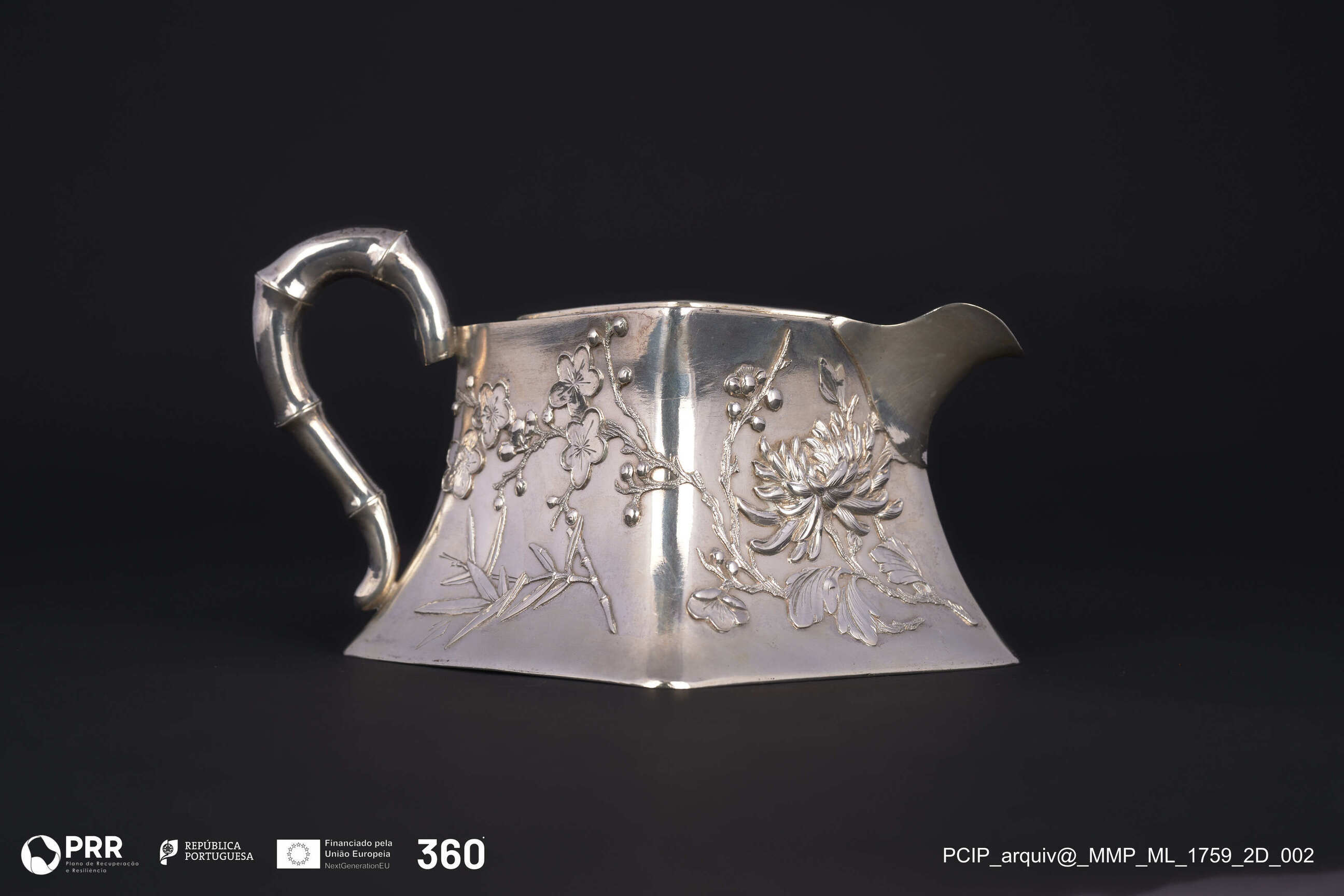 Matéria/Técnica: Prata fundida, cinzelada e dourada.; Cronologia: 1895-1905; Autoria: Wo Kwong; Dimensões (cm): Altura: 8 x Comprimento: 14,5.