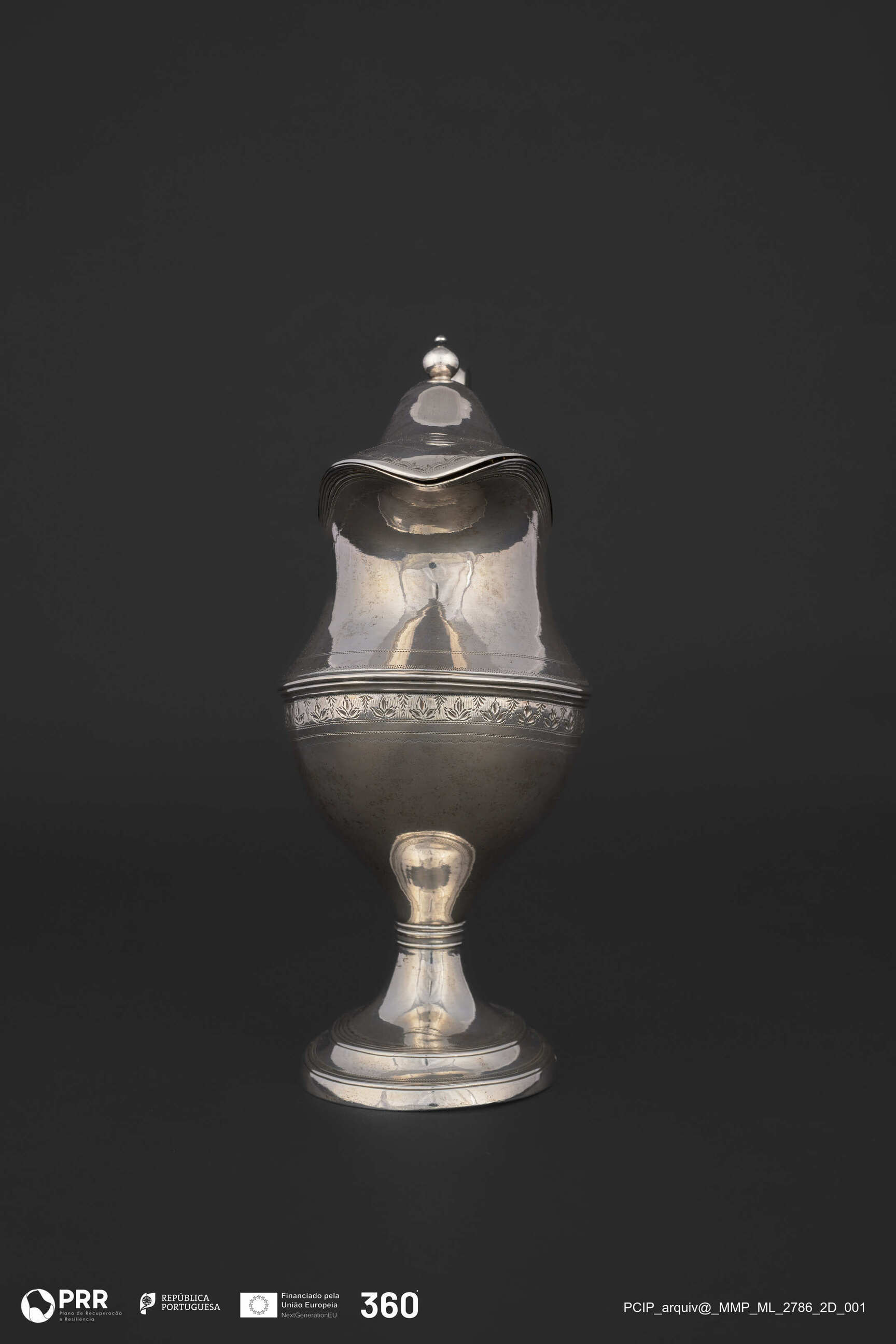 Matéria/Técnica: Prata fundida e cinzelada; Cronologia: 1801-1850; Autoria: Desconhecida; Dimensões (cm): Altura: 19,5 x Largura: 14,5 x Diâmetro: b. 9,1 x 7.