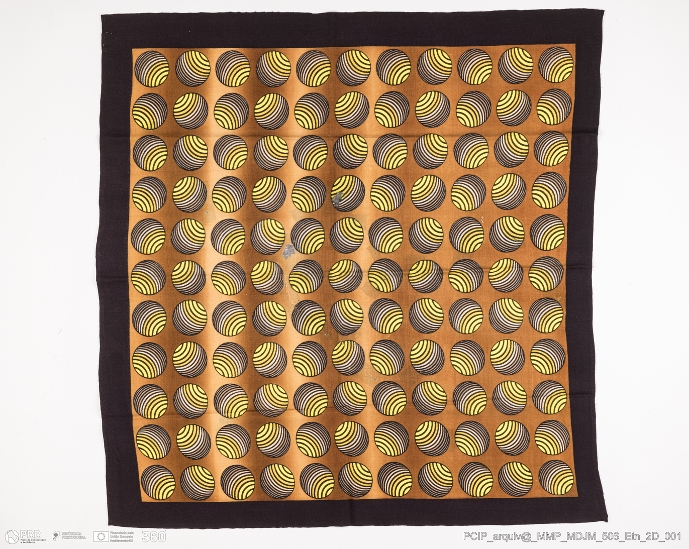 Matéria/Técnica: Lã fina; Cronologia: Séc. XX; Autoria: Desconhecida; Dimensões: Altura: 57 cm x Roda: 349 cm.