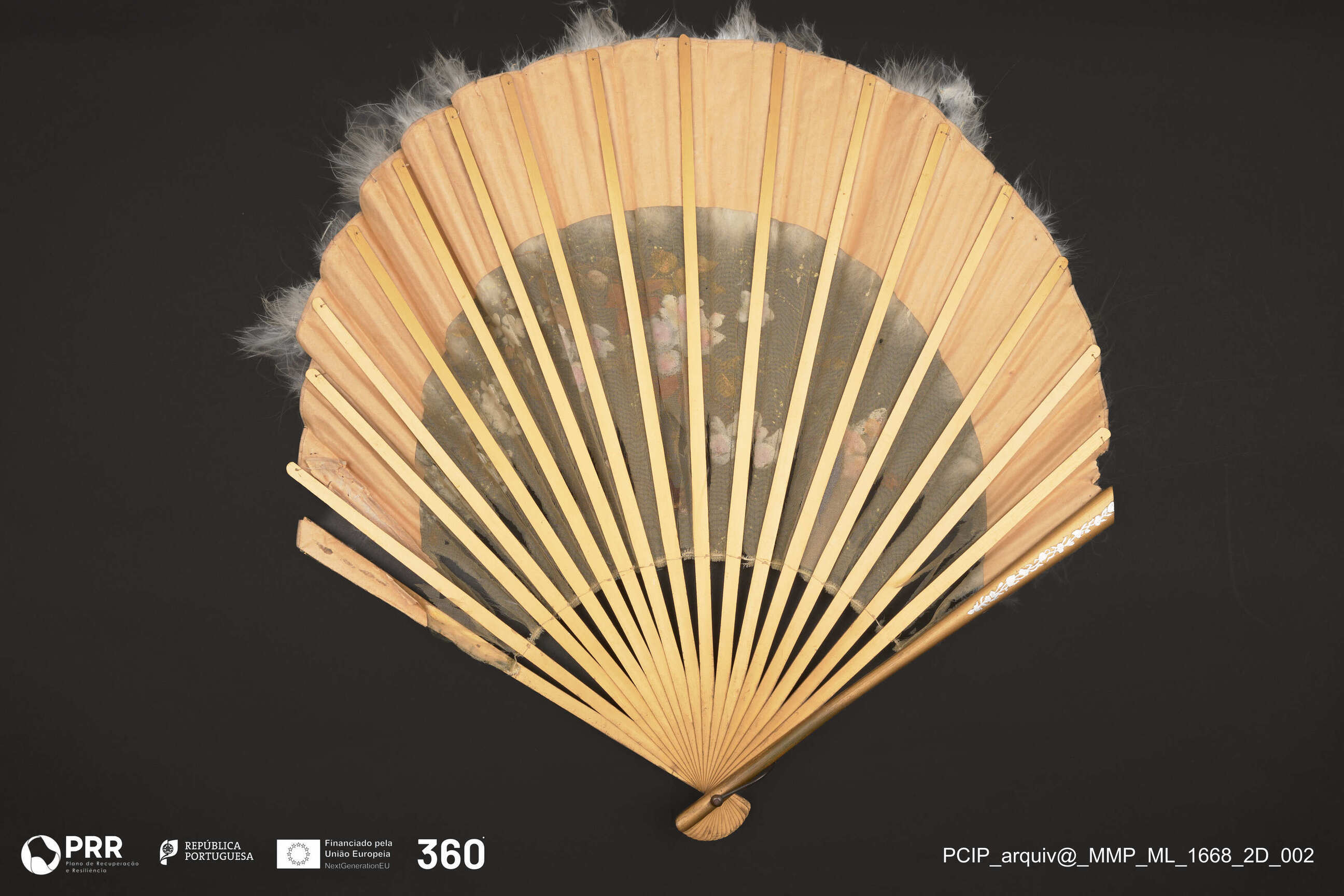 Matéria/Técnica: Folha pintada, madeira dourada e pintada, aplicação de plumas no topo da folha.; Cronologia: Século XIX; Autoria: Desconhecida; Dimensões (cm): Altura: 40 x Largura: 40.