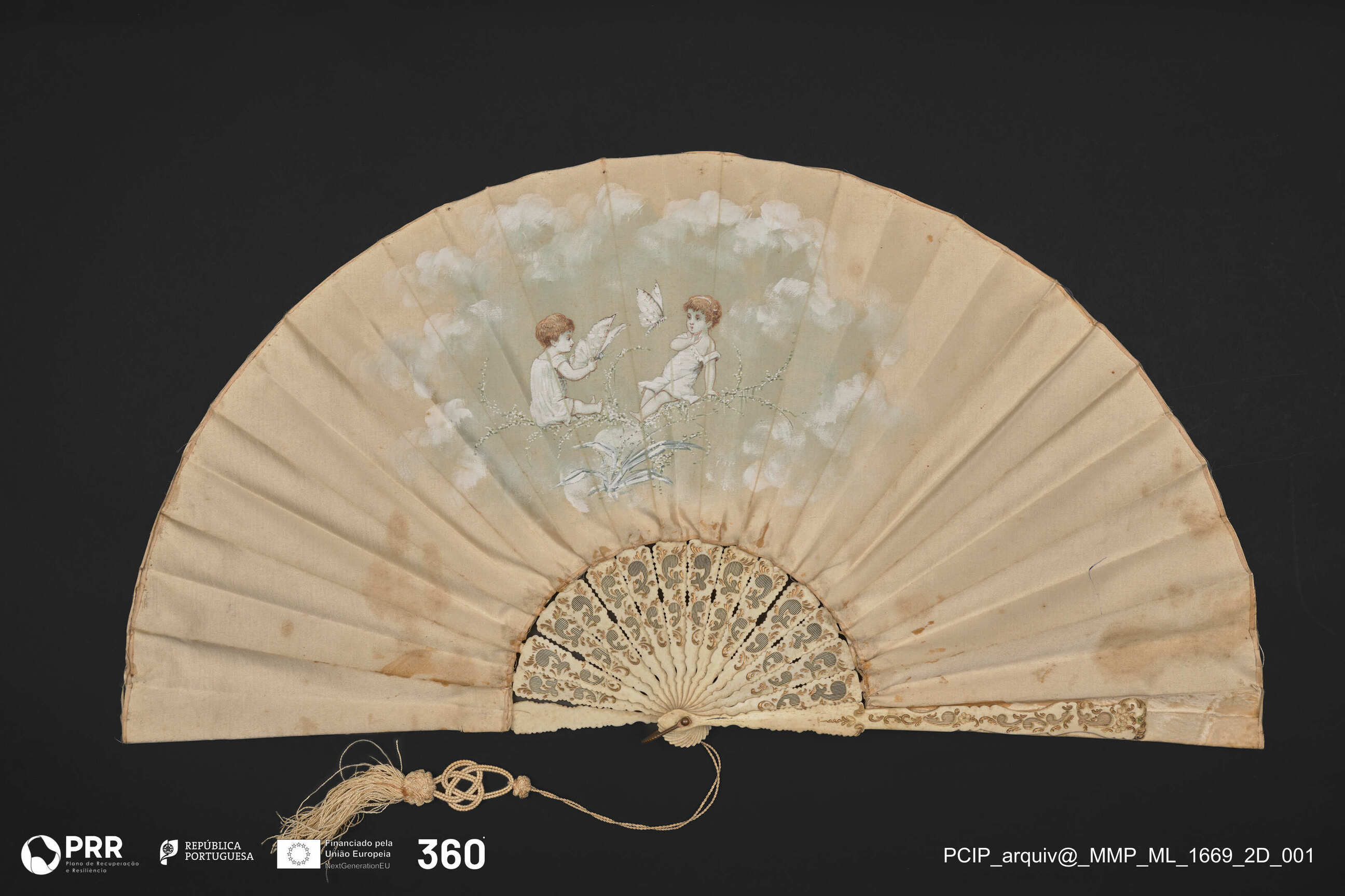 Matéria/Técnica: Folha em seda pintada, armação em marfim relevado com elementos dourados; Cronologia: Século XIX; Autoria: Desconhecida; Dimensões (cm): Altura: 29 x Largura: 54,5.